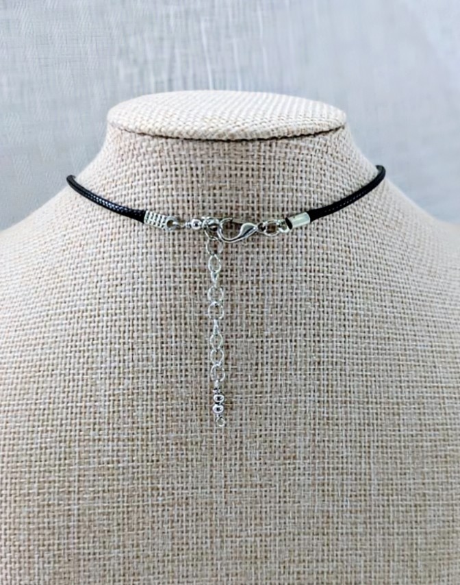 The glass locket is permanently glued closed and the waxed cotton cord is adjustable from 19" to 21" in length.