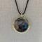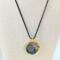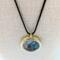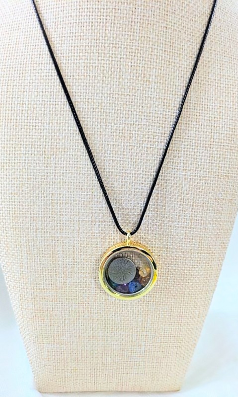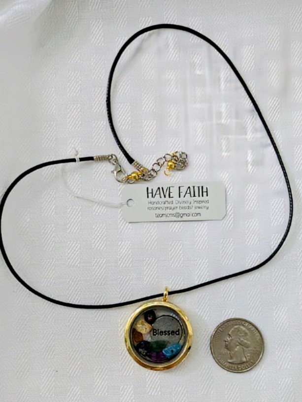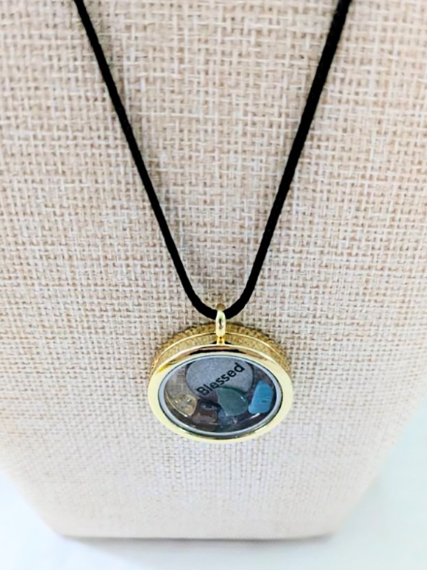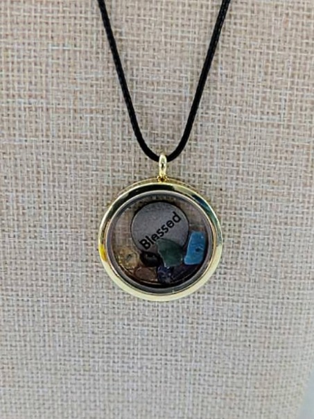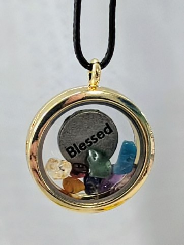 Gemstones represented in this locket are Amethyst, Lapis Lazuli, Apatite, Green Aventurine, Citrine, Carnelian and Garnet. The charm reads "Blessed." The leather cord is black and approximately 17" in length with a 2" extender. The locket has a gold-plated edge and is permanently glued closed.