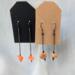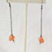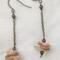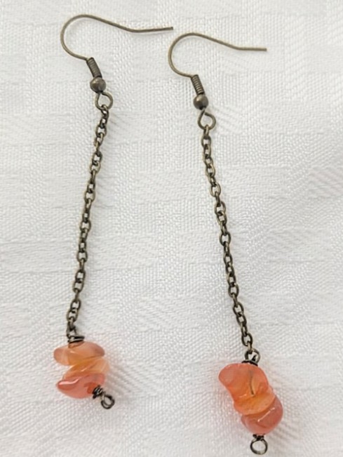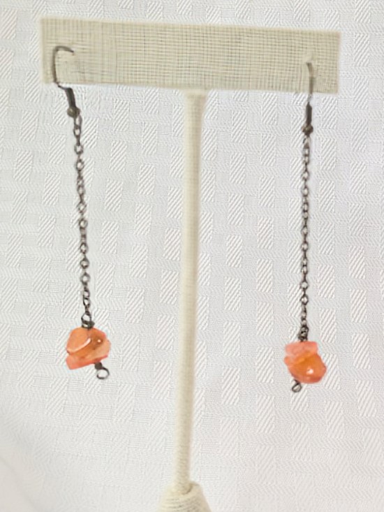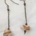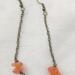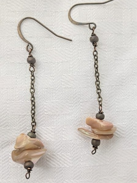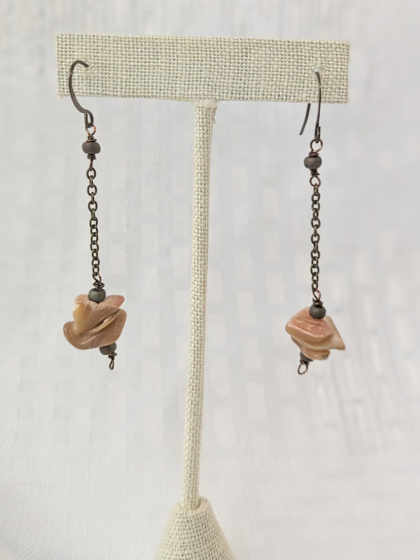 These gorgeous Chalcedony chips display a beautiful orange/pink hue and are stacked at the bottom of a 2 mm brass chain. The length of the chain from the bottom of the ear wire is approximately 2 1/2". In a similar style come these Abalone chip earrings, finished with glass seed beads. This Abalone was recently discovered in a shipping container from the 1960's. (very good quality). The length of the chain from the bottom of the ear wire is approximately 2".