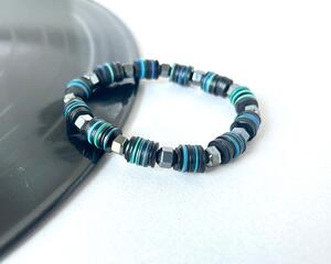 Recycled Vinyl Record and Hematite Men's Stretchy Bracelet