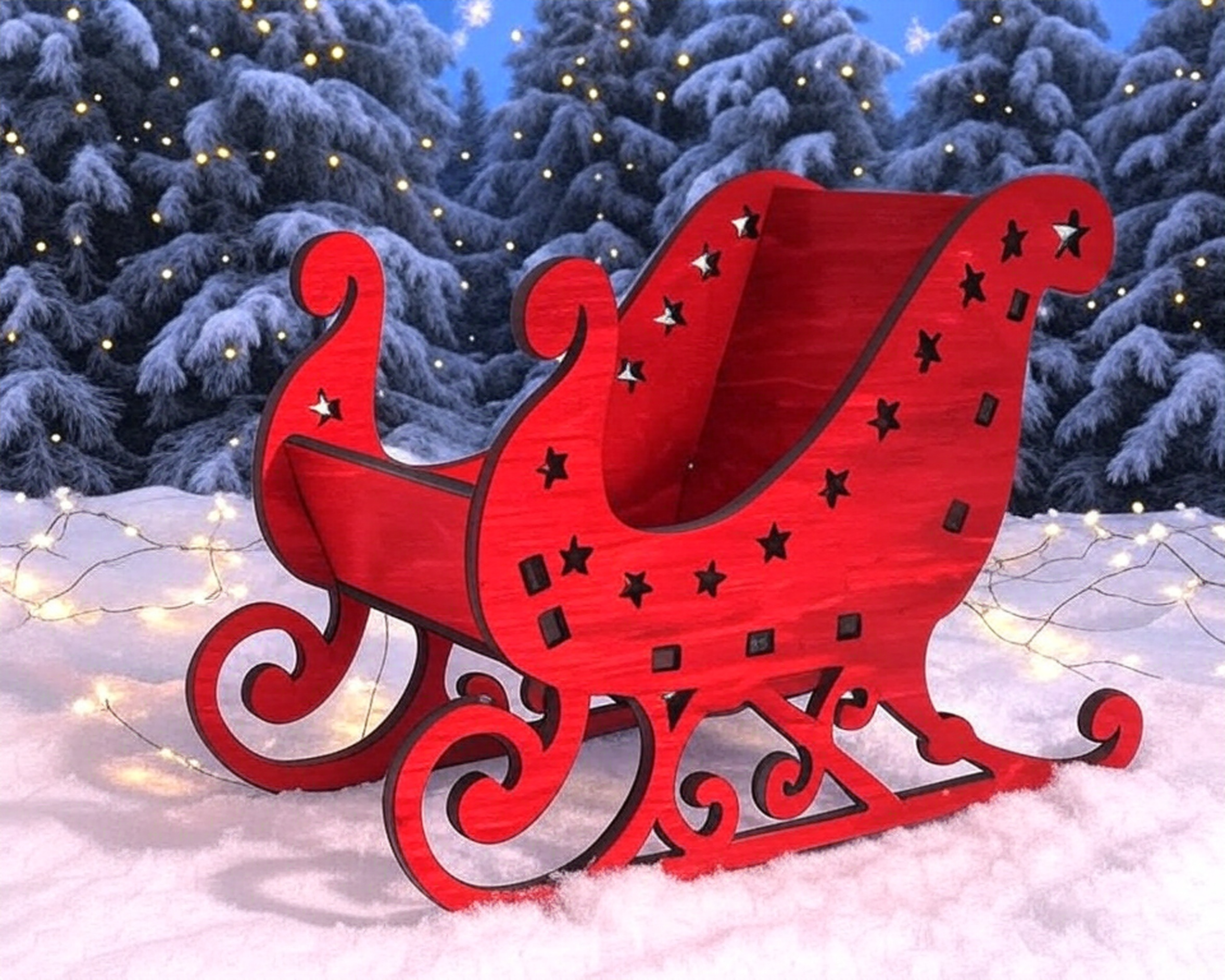 Add a touch of holiday magic to your home with this stunning red veneer sleigh! Crafted from rich, vibrant wood, its intricate star-cut design and elegant curves make it a perfect centerpiece for your Christmas decor. Ideal for holding gifts, ornaments, or simply as a charming display piece. Features: