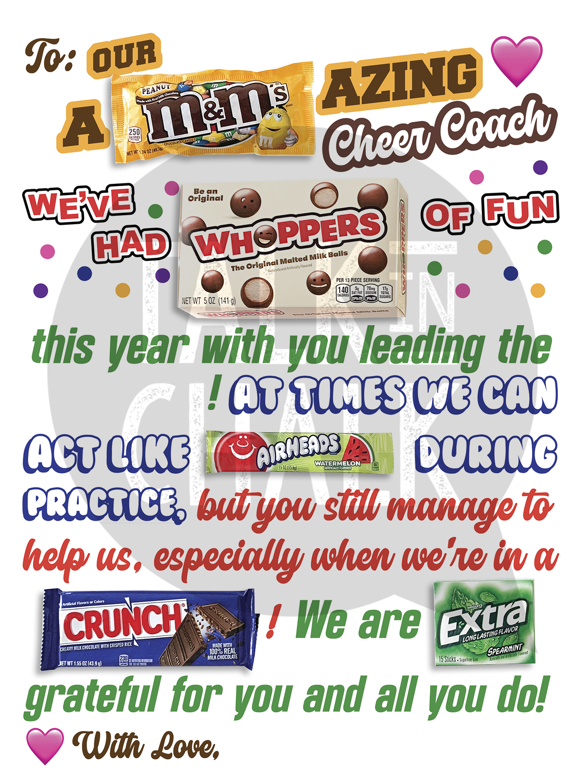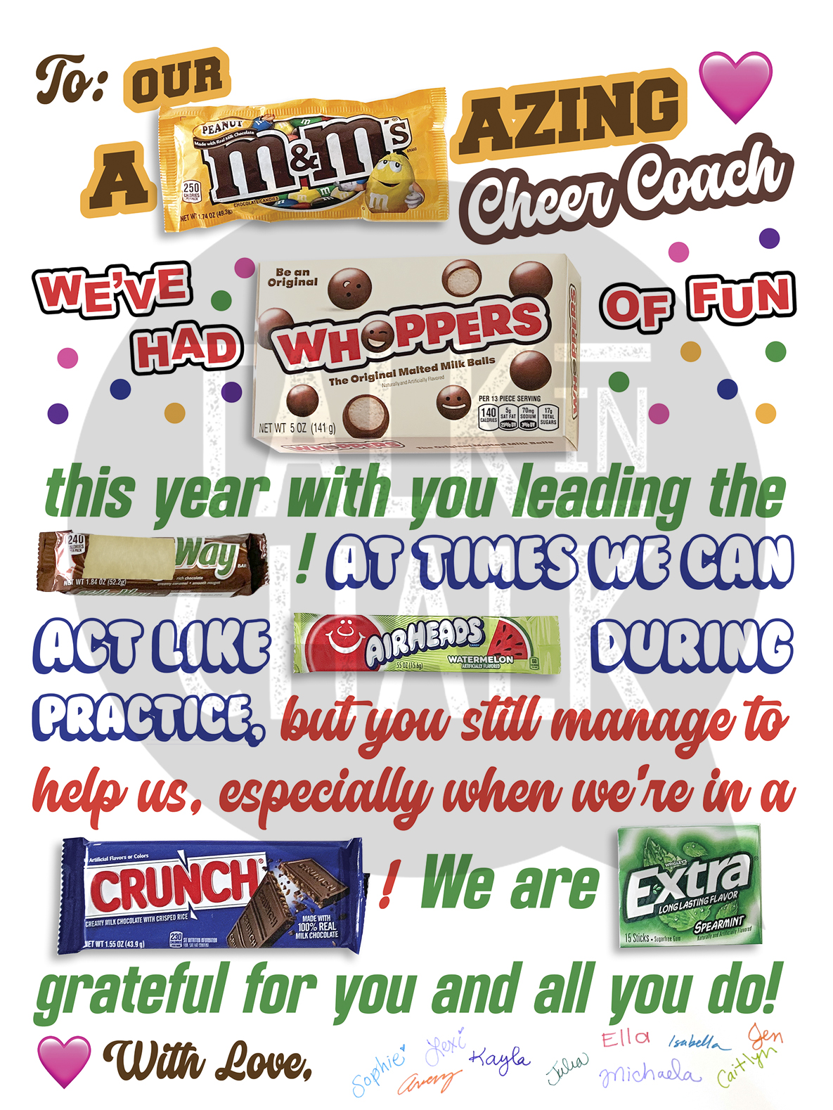 Celebrate your Cheer coach with this fun and heartfelt Candy Bar Coach Appreciation Poster! Perfect for end-of-season gifts, this printable is a creative and delicious way to say THANK YOU. This candygram poster blends humor, appreciation, and sweetness in one easy DIY gift. Just print, add the matching candy bars, and you’ve got a sweet surprise your coach will never forget!