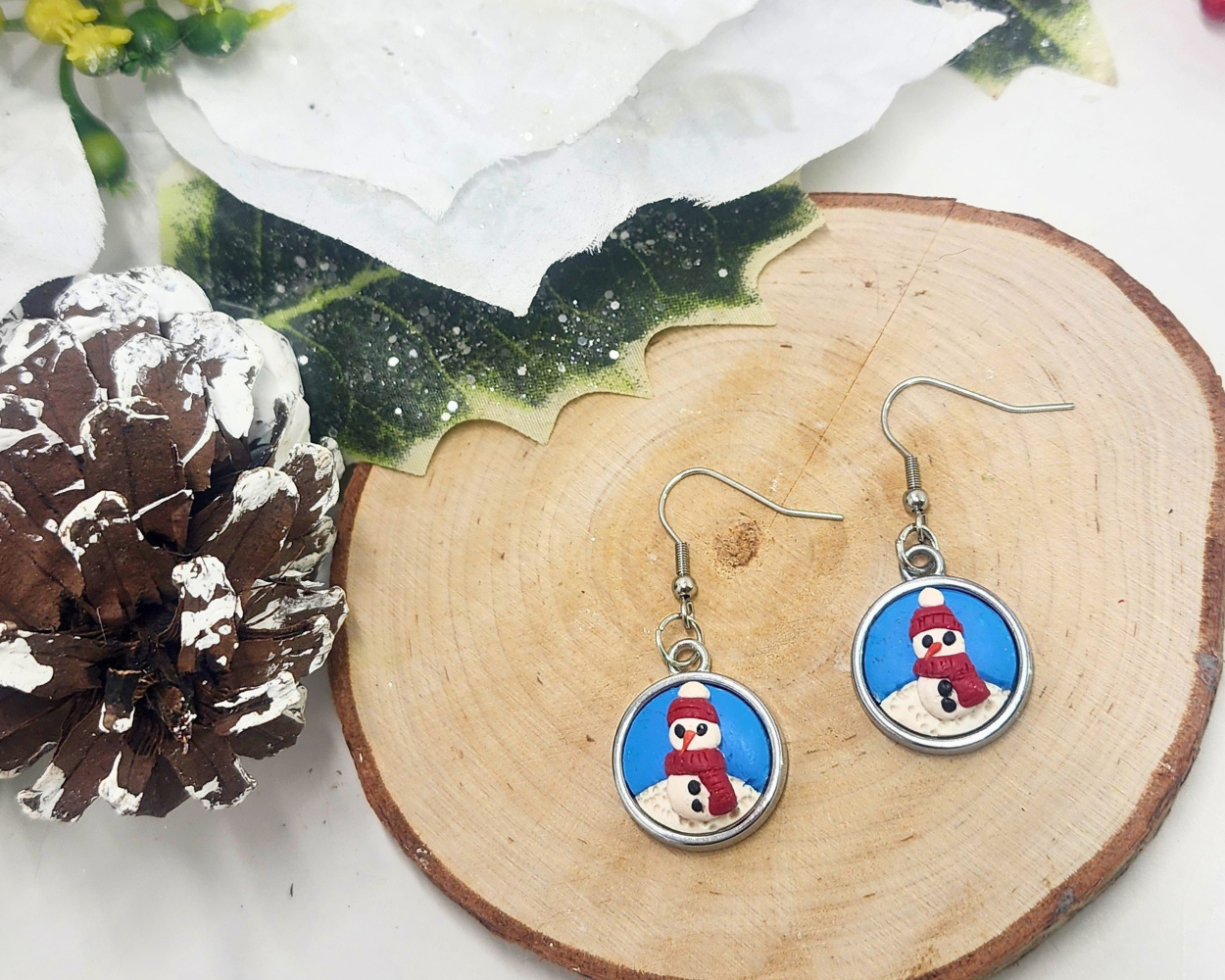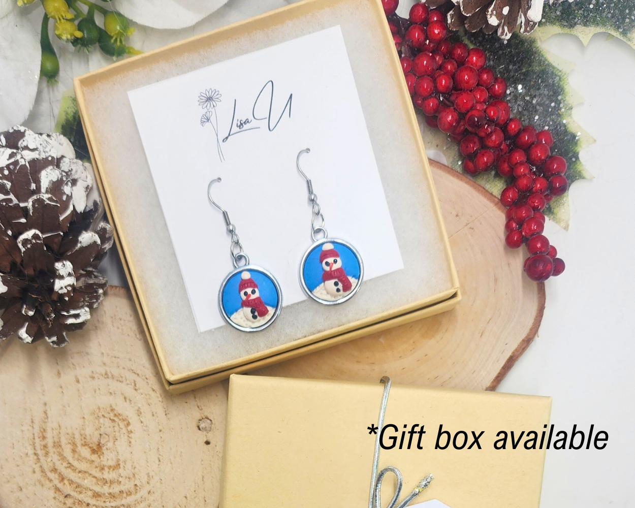 These adorable Snowman Dangle Earrings are the perfect way to carry a little winter cheer with you everywhere. Each earring features a tiny, hand-sculpted polymer clay snowman—complete with a carrot nose, black coal eyes, and a festive red scarf—set against a bright blue sky and snowy base.