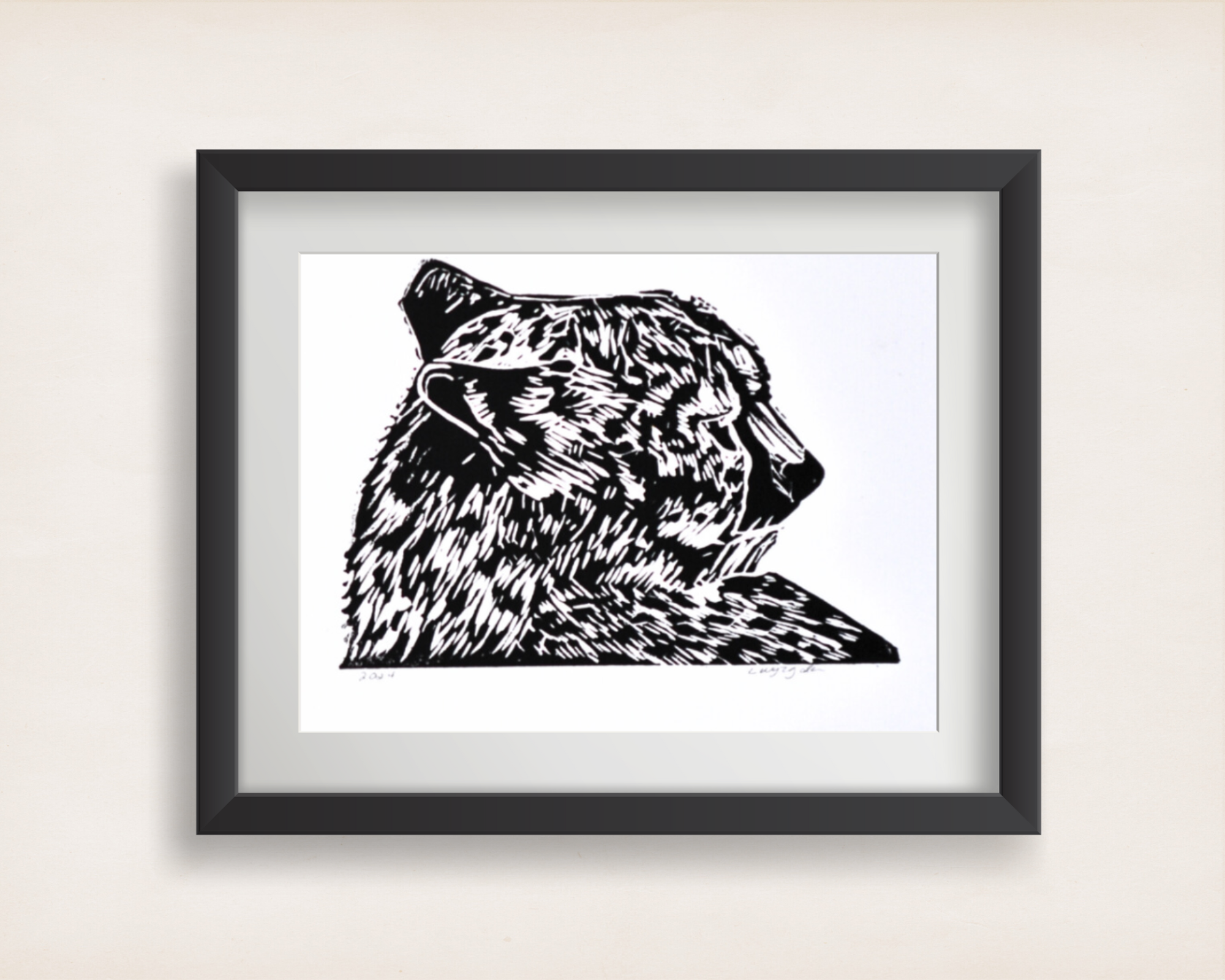 This Cheetah Profile linocut print was drawn onto a linoleum block by me and carefully carved using special carving tools, then after all the carving comes the fun part to print! I use quality paper and archival oil-based printing ink for all my linocut prints. I also have a hand press that I print with that gives me nice control over the pressure for each print. This print is truly unique!