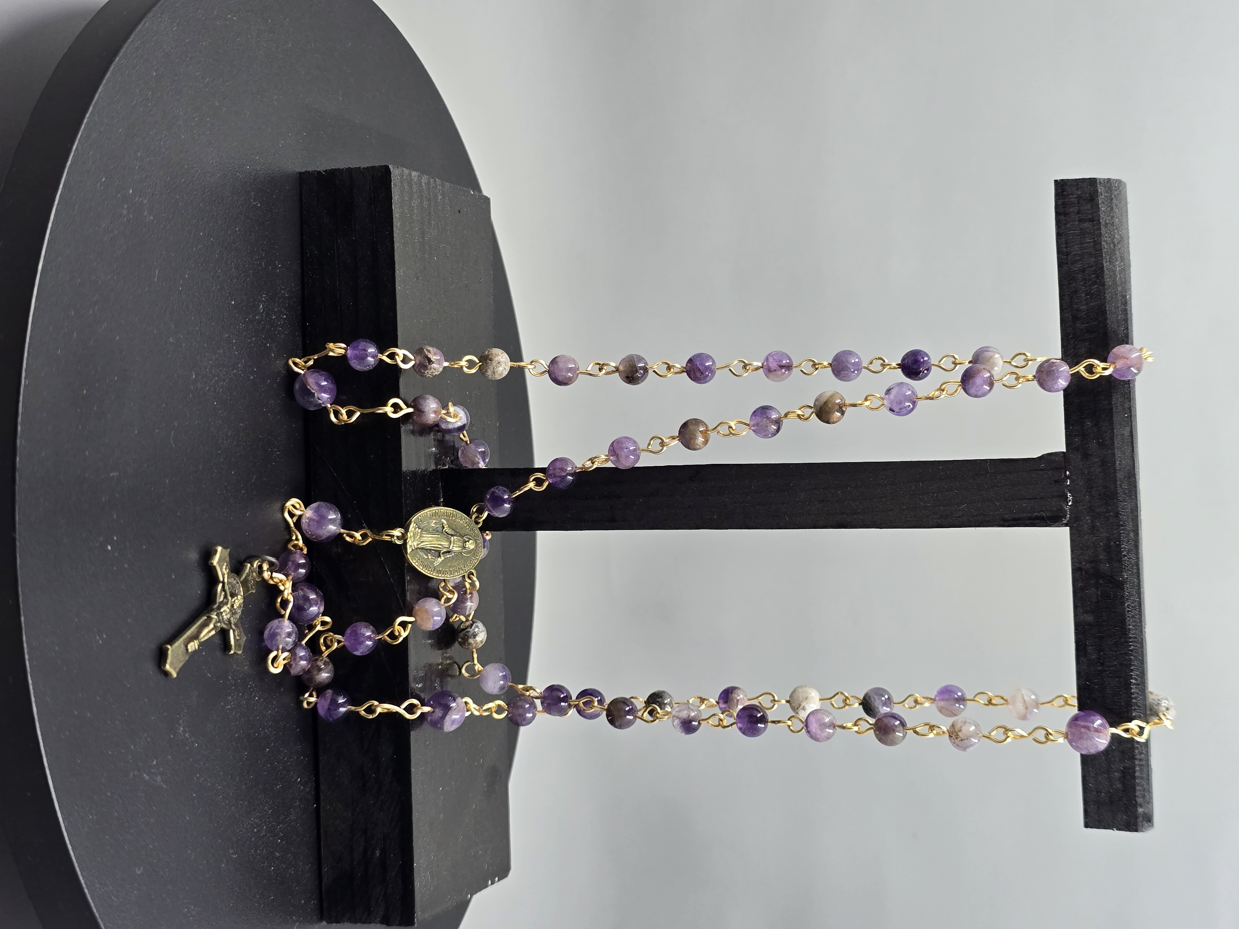 This Rosary is made from natural chevron amethyst. Each link is made from silver coated, tarnish resistant gold colored wire.