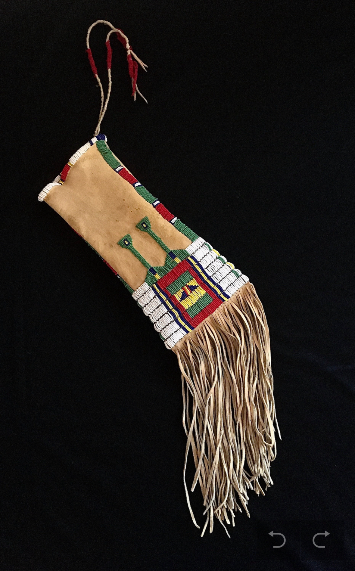 Beginning with a top quality deer hide hand stitched with Sinew. An elaborate bead pattern With a stunning array of colors, Lavished in traditional patterns. Beaded front and back, along both sides, and along the bags top. Hand wrapped red wool along the carrying straps of the bag with additional sinew wrapping.