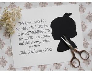 Another unforgettable part of our story with Ada was the way that God met our needs through His inspired Word, and that's why a portion of my shop is dedicated to silhouettes paired with hand-lettered calligraphy of Scripture verses. These serve a memorial not only of these priceless childhood days but also of the faithful God whose Word is able to accompany those children all their lives, through every joy and every sorrow.