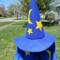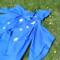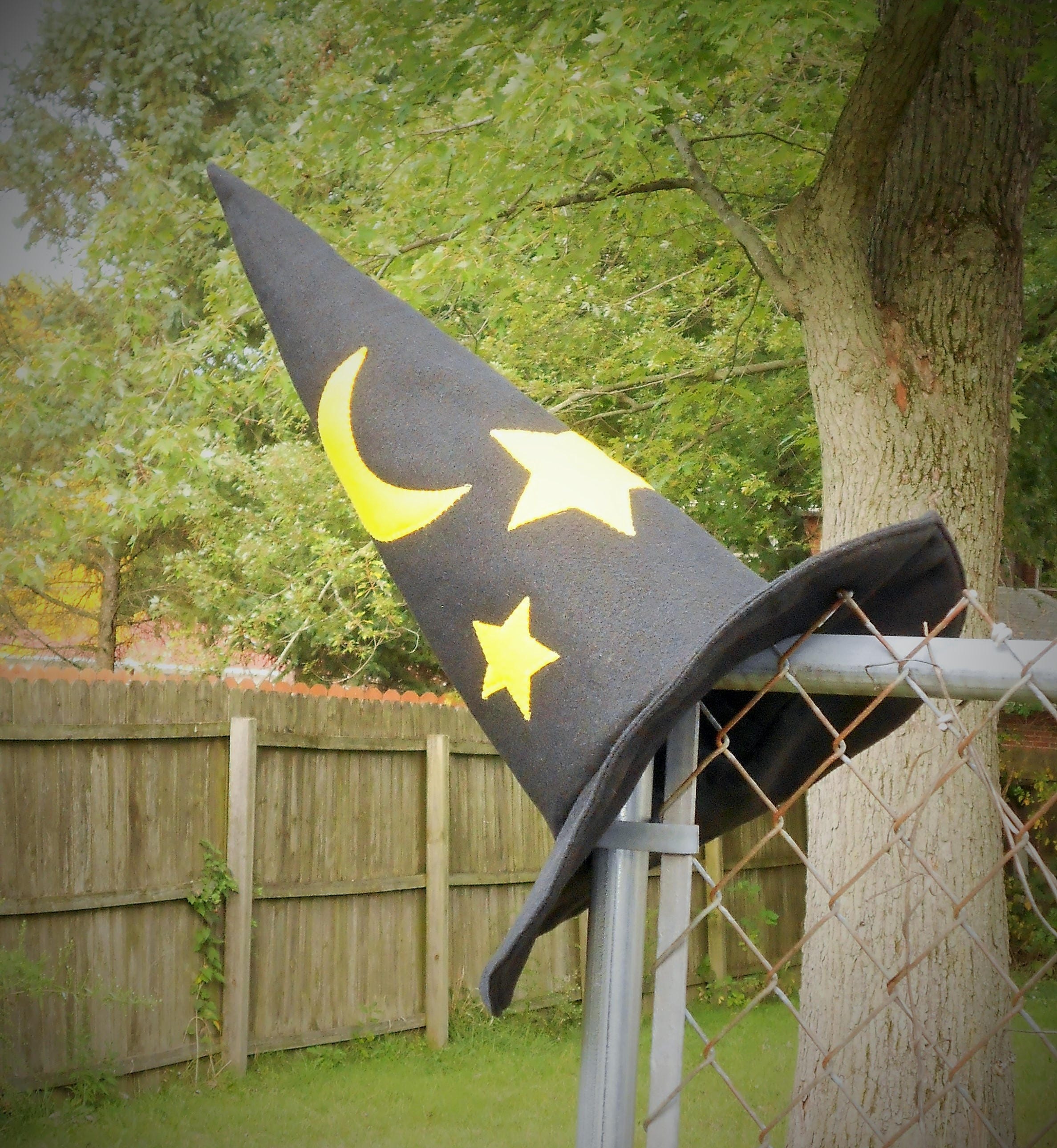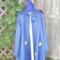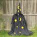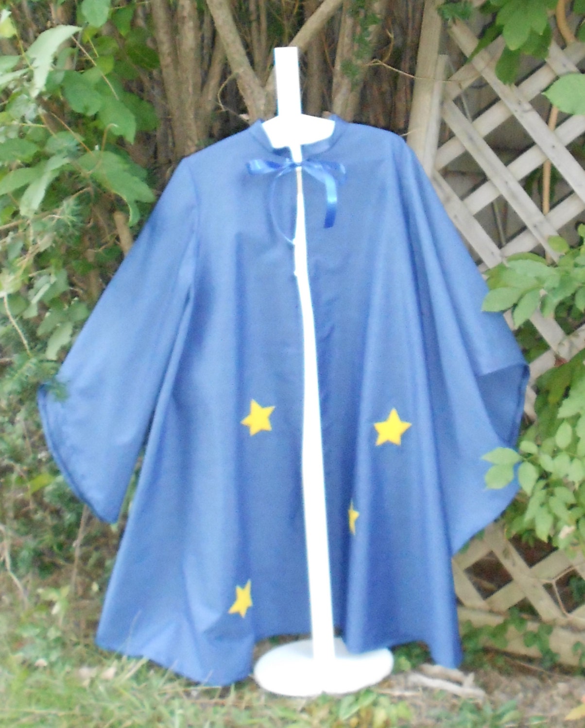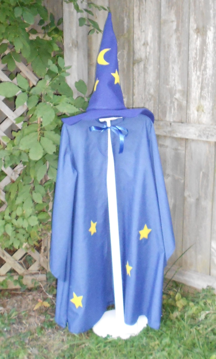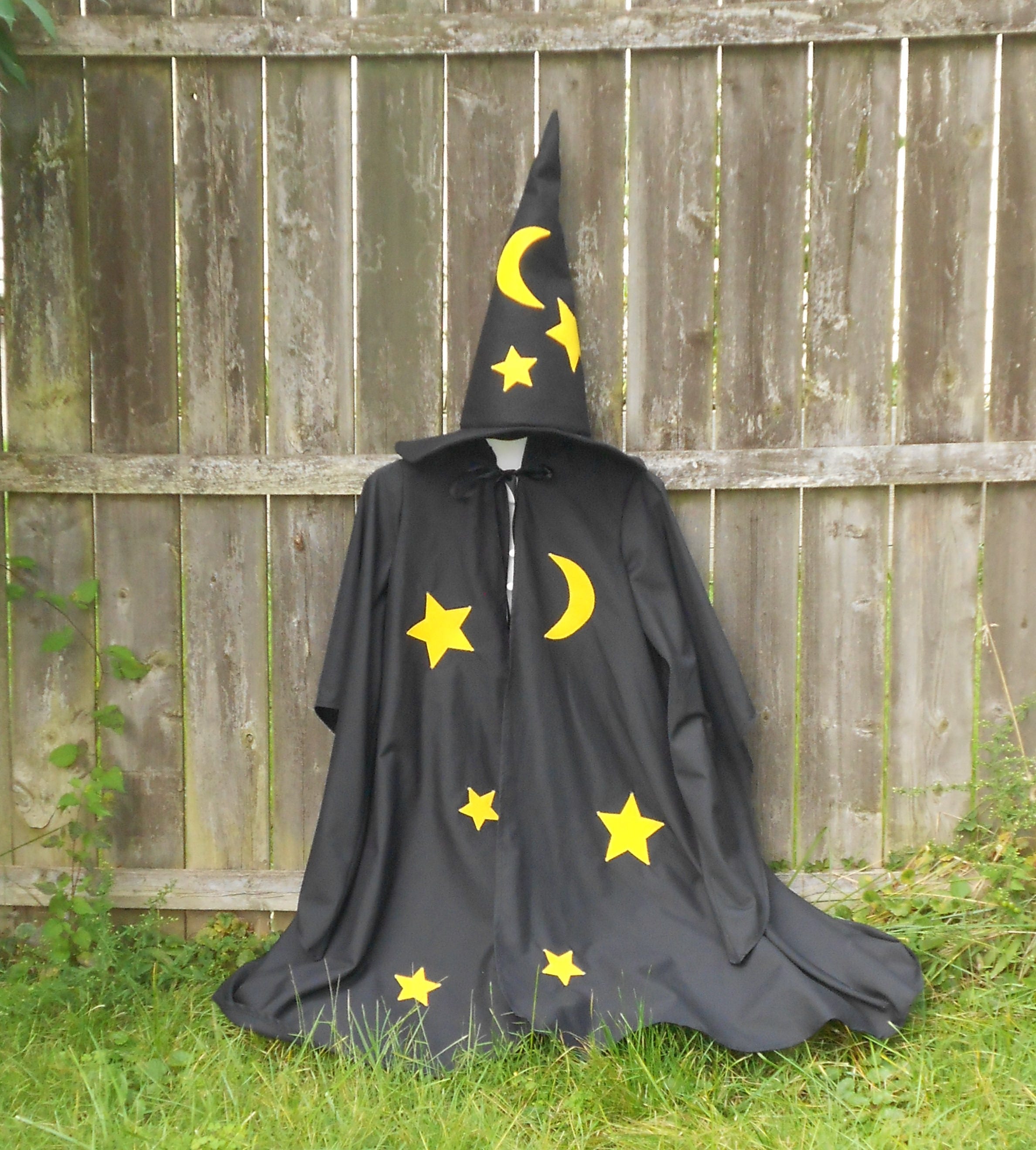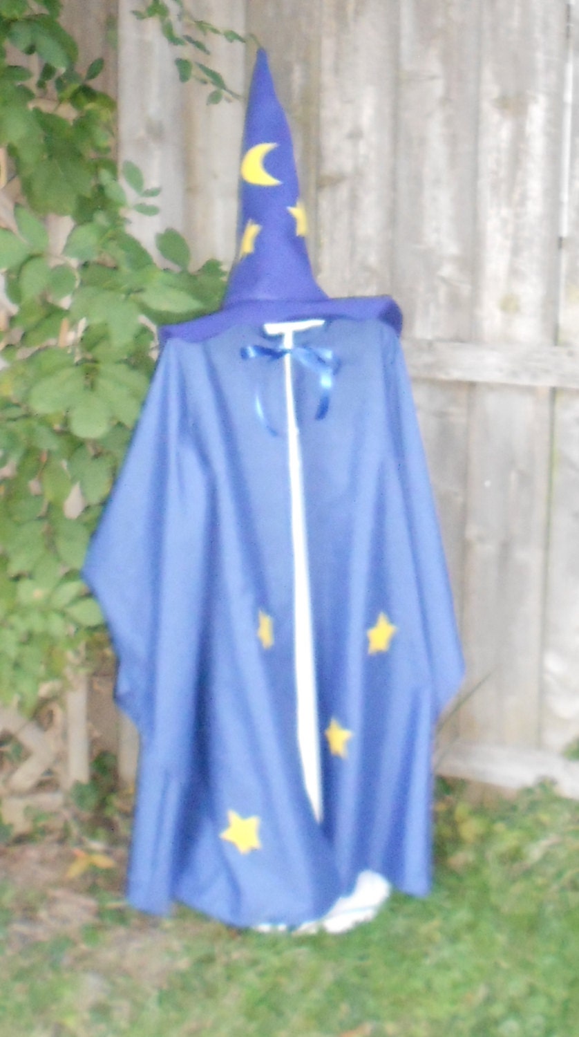 Merlin Inspired - Cloak with pointy sleeves and Felt Wizards hat. The cloak is made of a light weight polyester blend fabric and has hook and loop tape closure at the neck with a decorative ribbon bow and has machine applique stars. The wizards hat is made from a heavyweight felt and also has stars appliqued onto it.