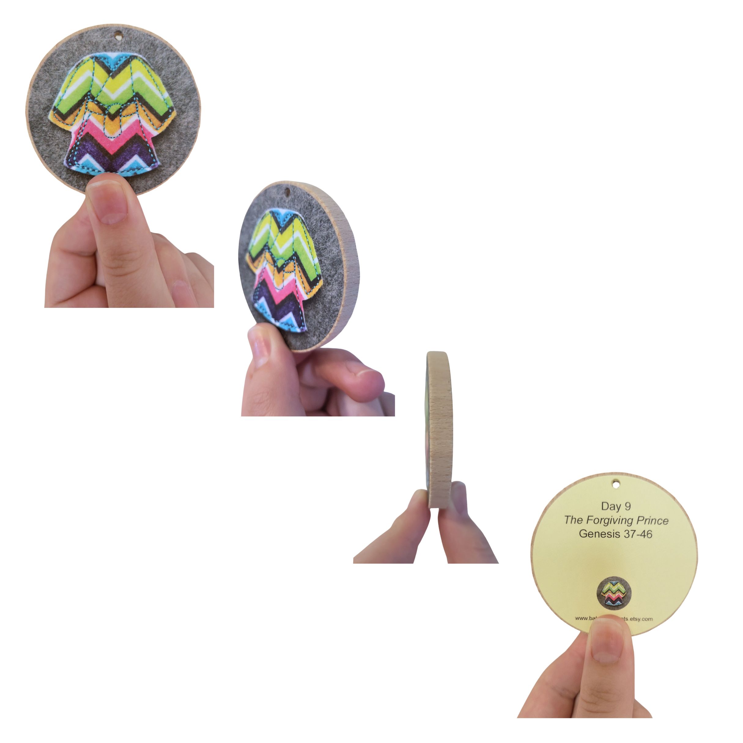 Jesse Tree ornaments are approximately 1/4" thick and 2 3/8” in diameter. The front side features a colorful image made from high resolution photos of our felt ornaments. The images have been printed on vellum with a permanent adhesive backing. The back side indicates the day the ornament is to be hung, and both the Bible verse and the chapter to read in the book, The Advent Jesse Tree by Dean Lambert Smith (please note, the book is not included). You will also receive a velour drawstring bag for storage and a colorfully illustrated pamphlet. If you do not have the book, you can simply use a regular Bible and follow the scriptures outlined in the pamphlet or the back of the ornament.