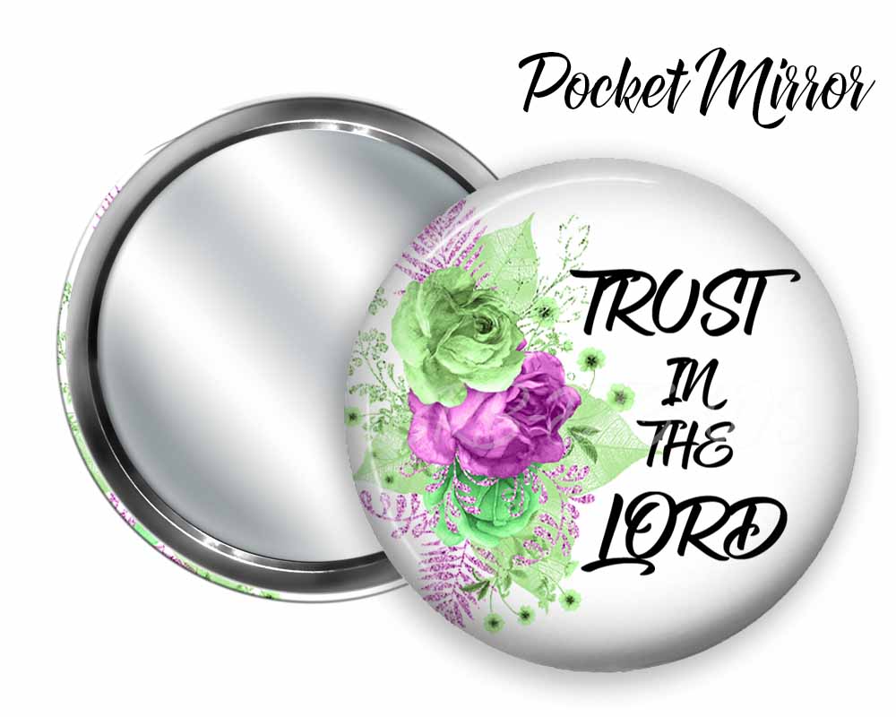 A small colorful and beautiful mirror for handbags, pockets, gym bags, or office desk. It has a nice Christian say of, "Trust In The Lord."