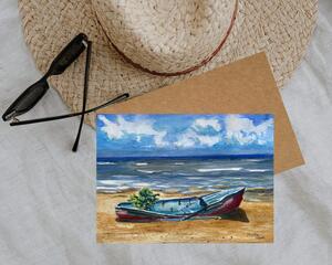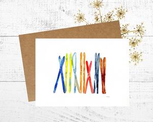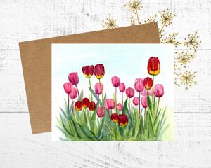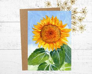 This is a greeting card from a hand painted watercolor of different colored sunflowers of red orange and yellow.