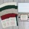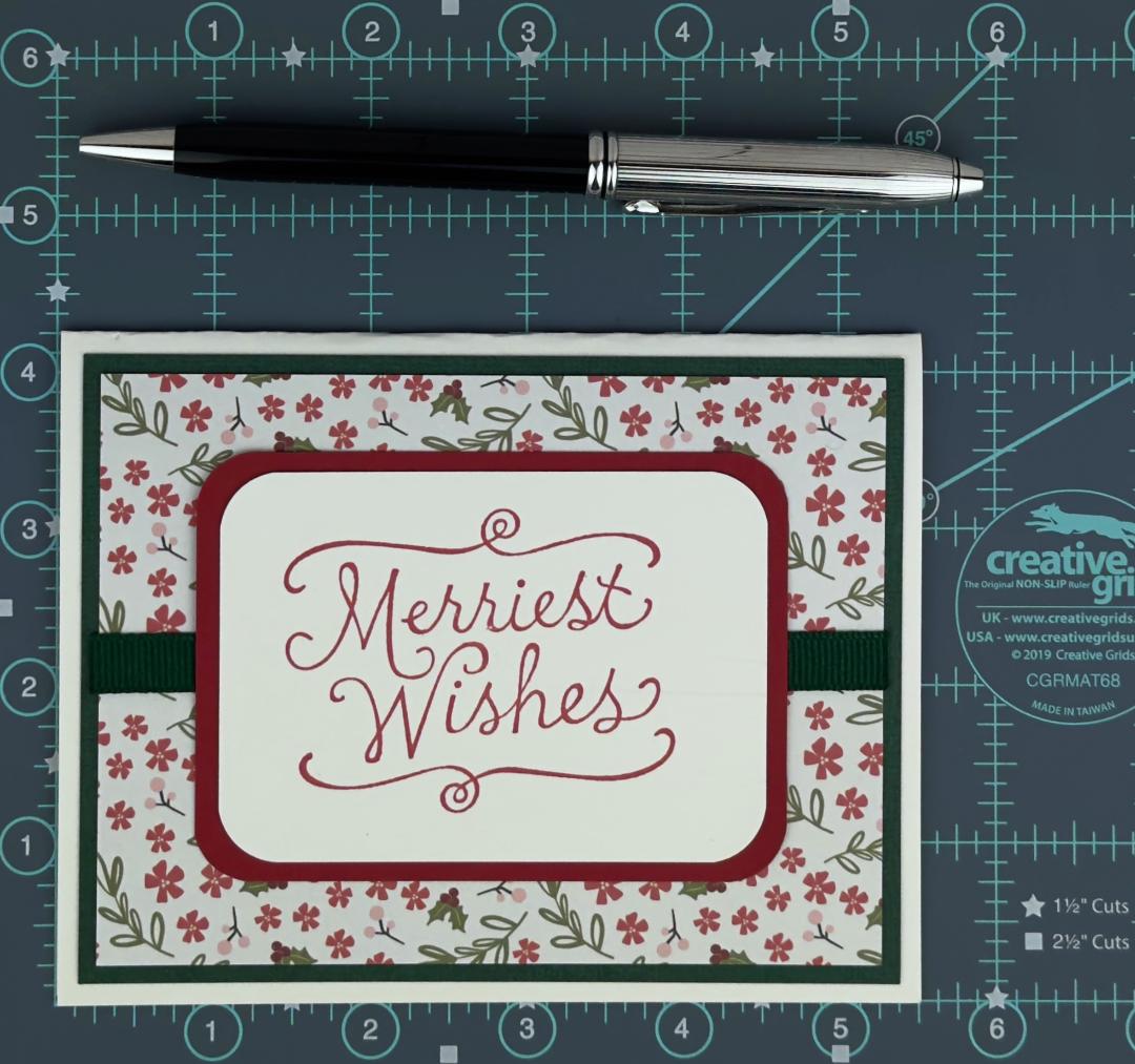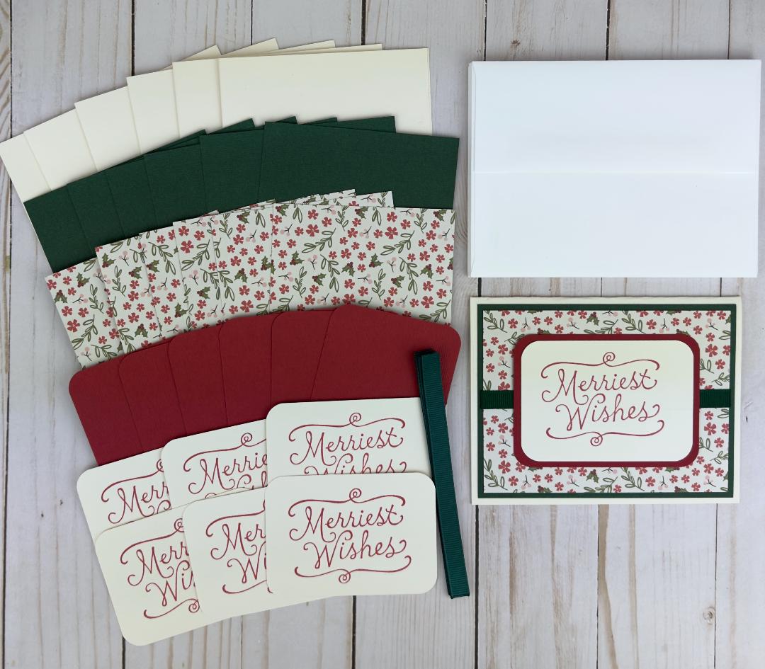 * 6 hand-stamped "Merriest Wishes" sentiments in red ink on off-white cardstock with adhesive