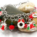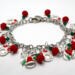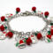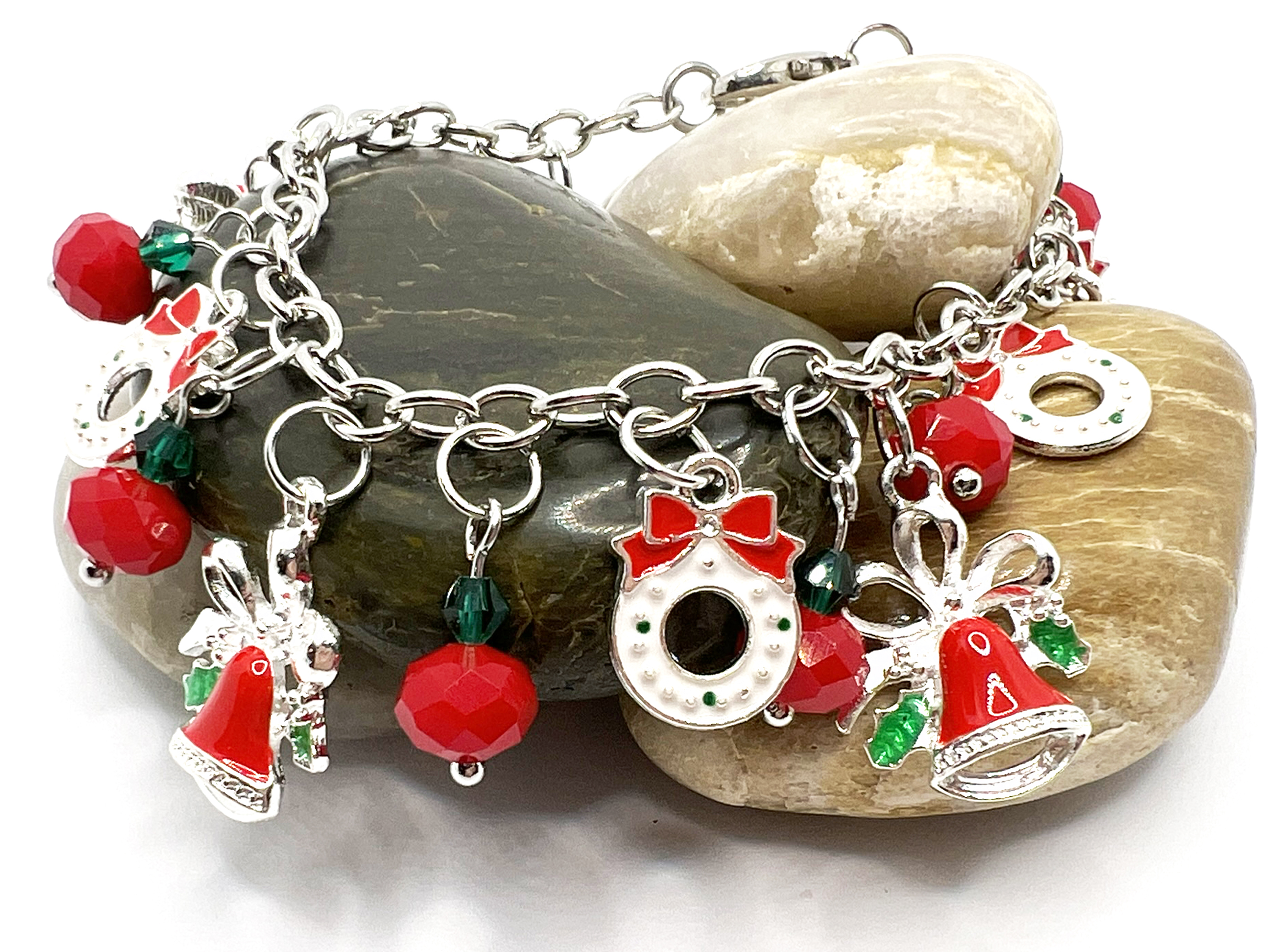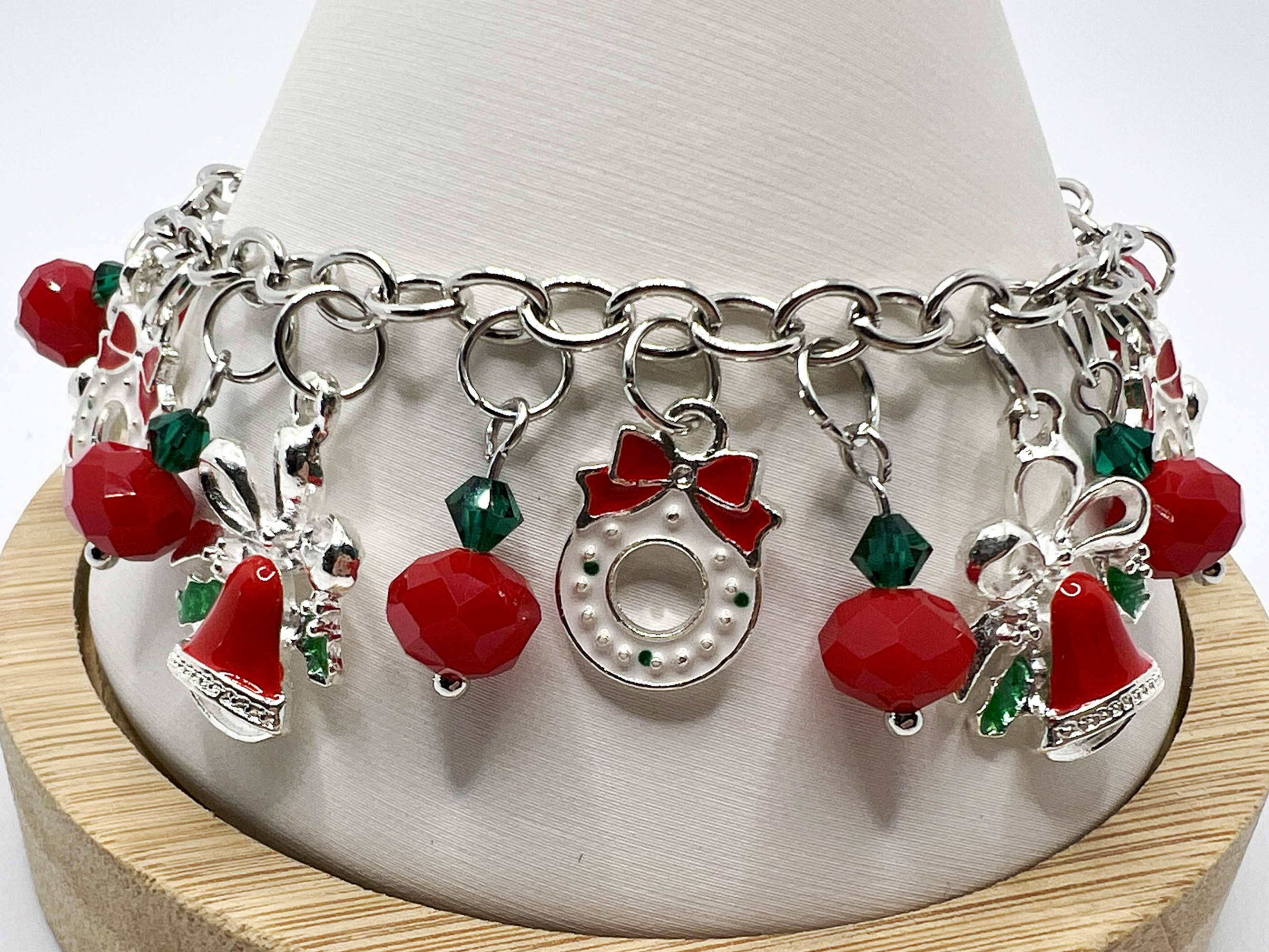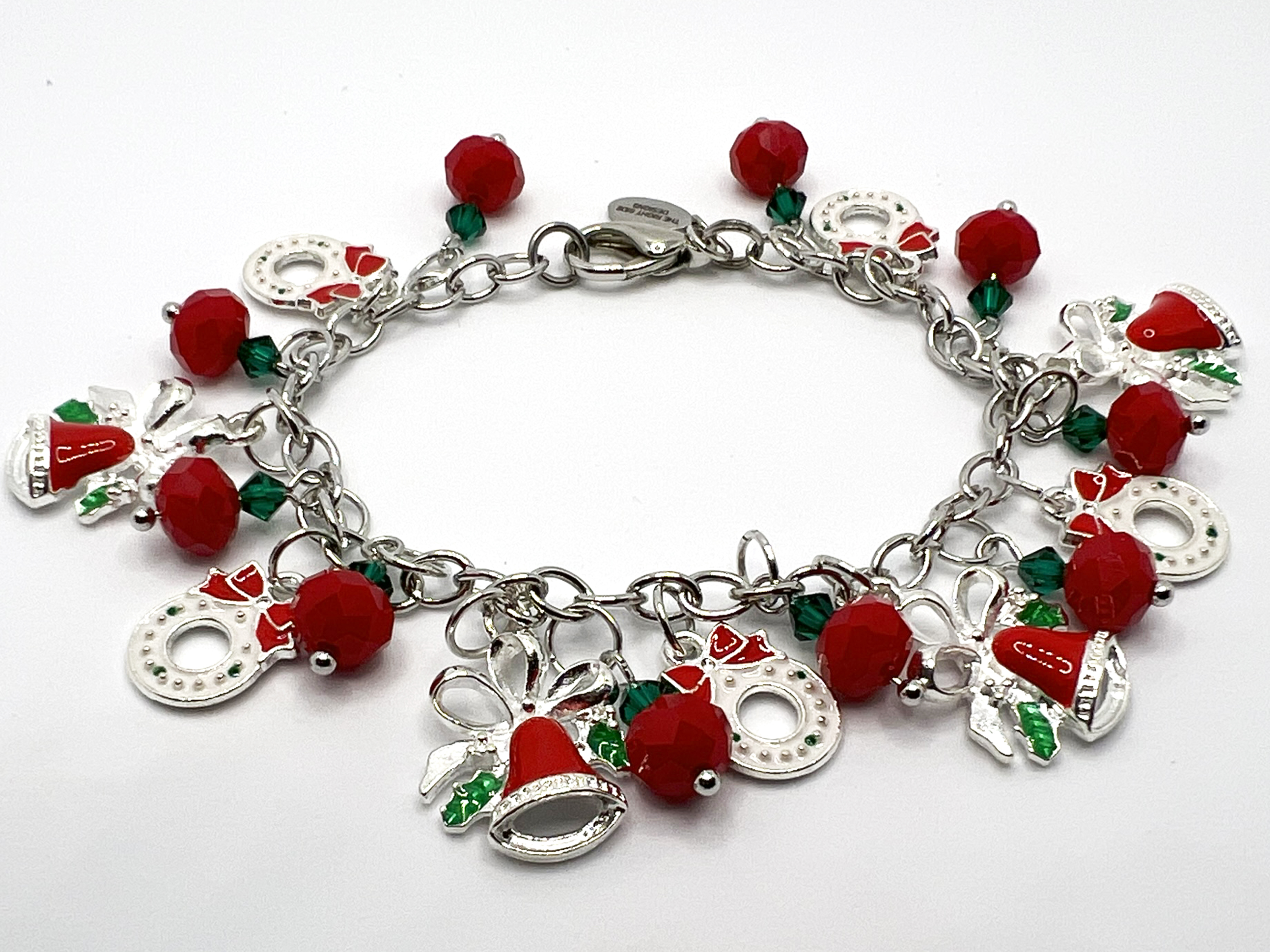 Add a little holiday cheer to your look with this playful Christmas charm bracelet! Crafted on a silver-toned cable chain, it features 24mm red enamel bells, 20mm white wreaths, and sparkling 8mm red rondelle glass beads accented with 4mm green crystals. The perfect accessory to celebrate the season in style!