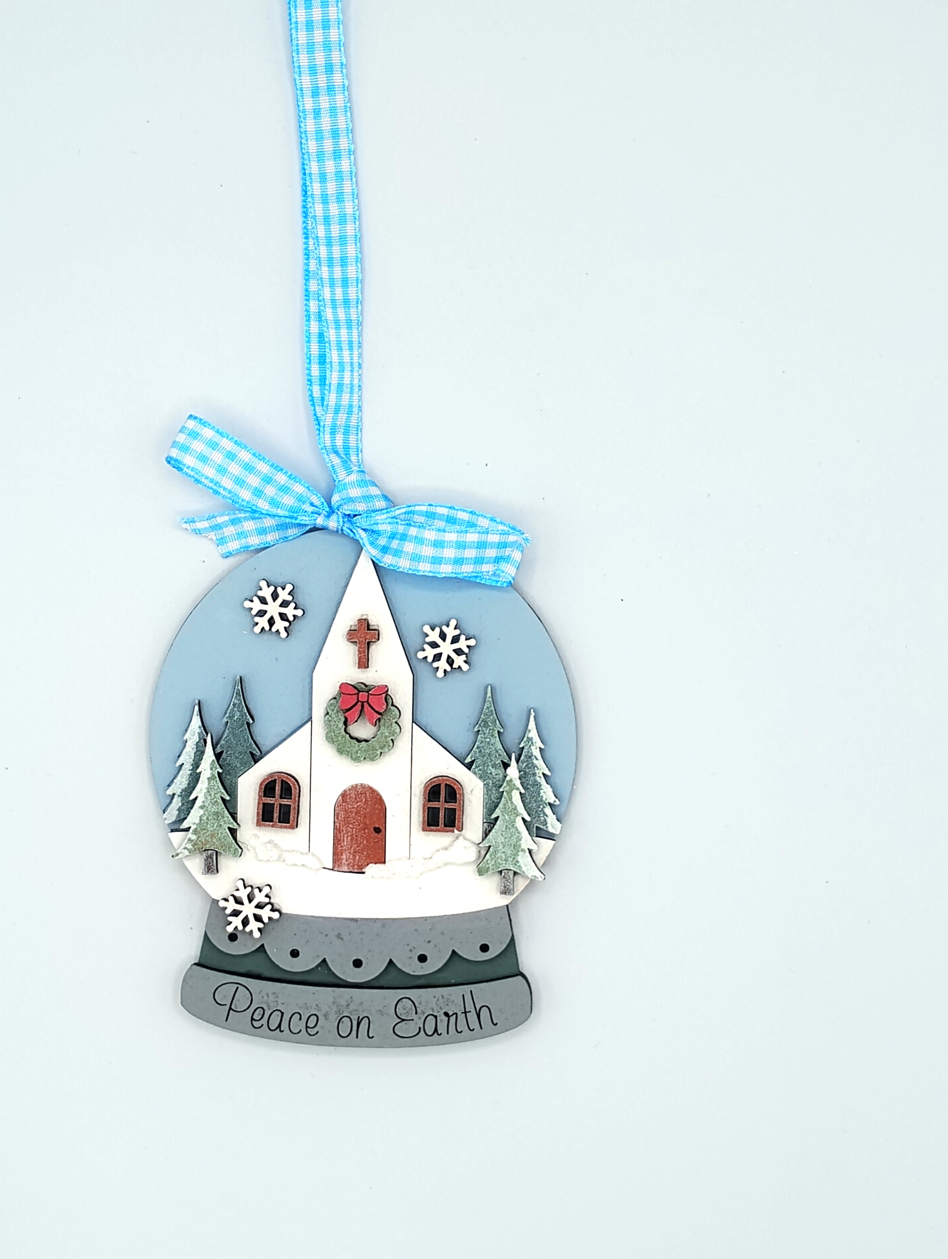 This listing is for a Vintage Christmas Church layered snow globe ornament. Laser cut from 1/8" wood and hand-painted with care. SnowTex and glitter accents add texture and shimmer