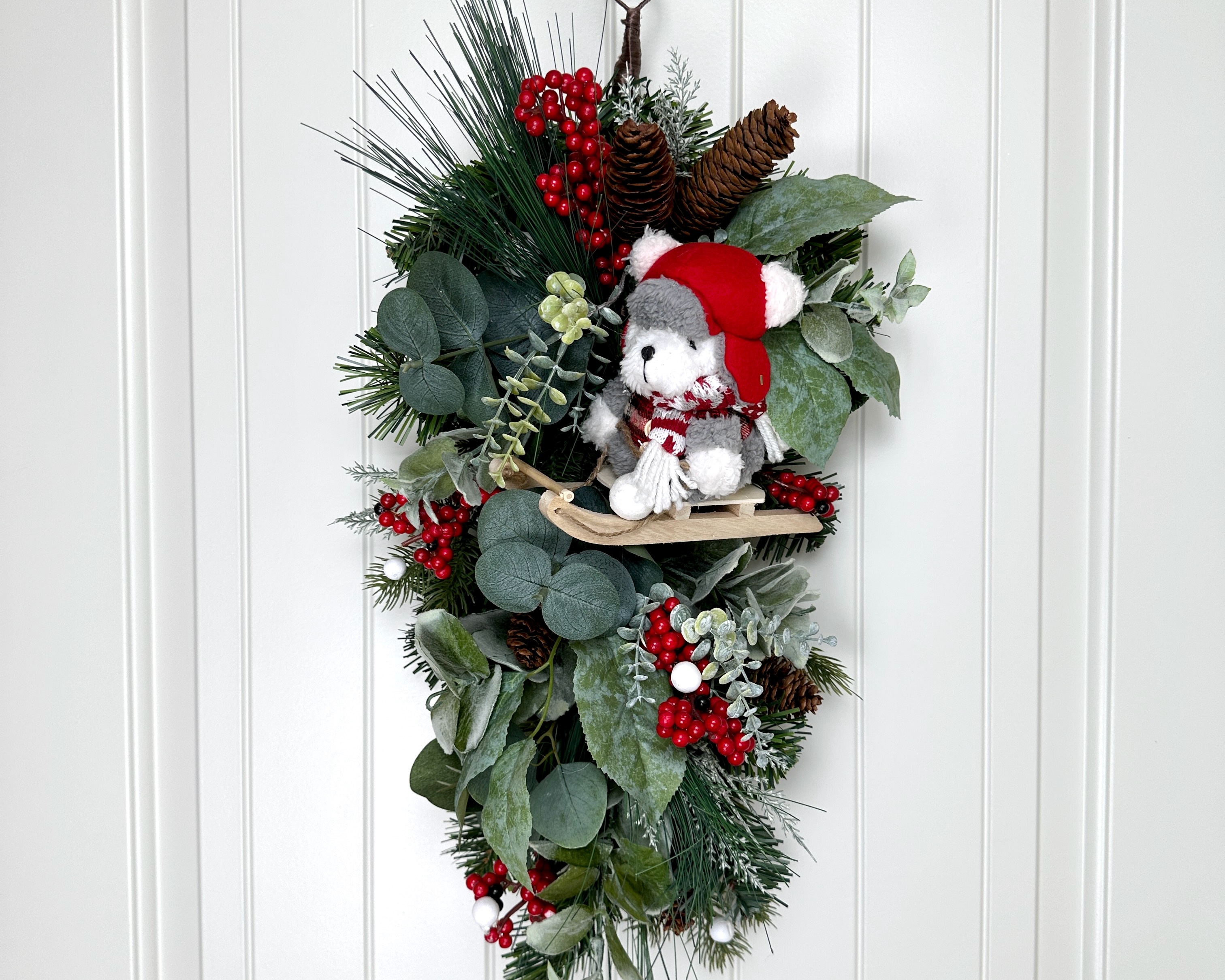 This evergreen Christmas Wall or Door Swag Wreath will add a touch of rustic charm to your holiday decor. A snow bear on a sled and a mix of evergreens, pinecones, and red berries, this door swag is a perfect blend of classic and contemporary holiday styles.