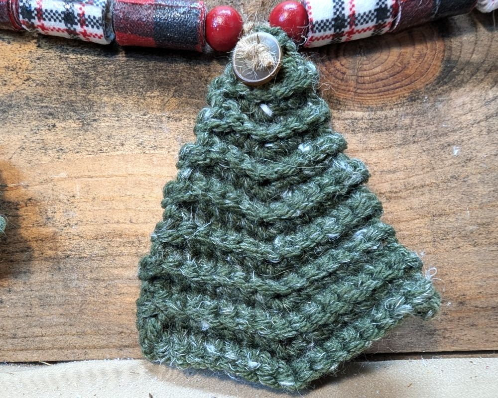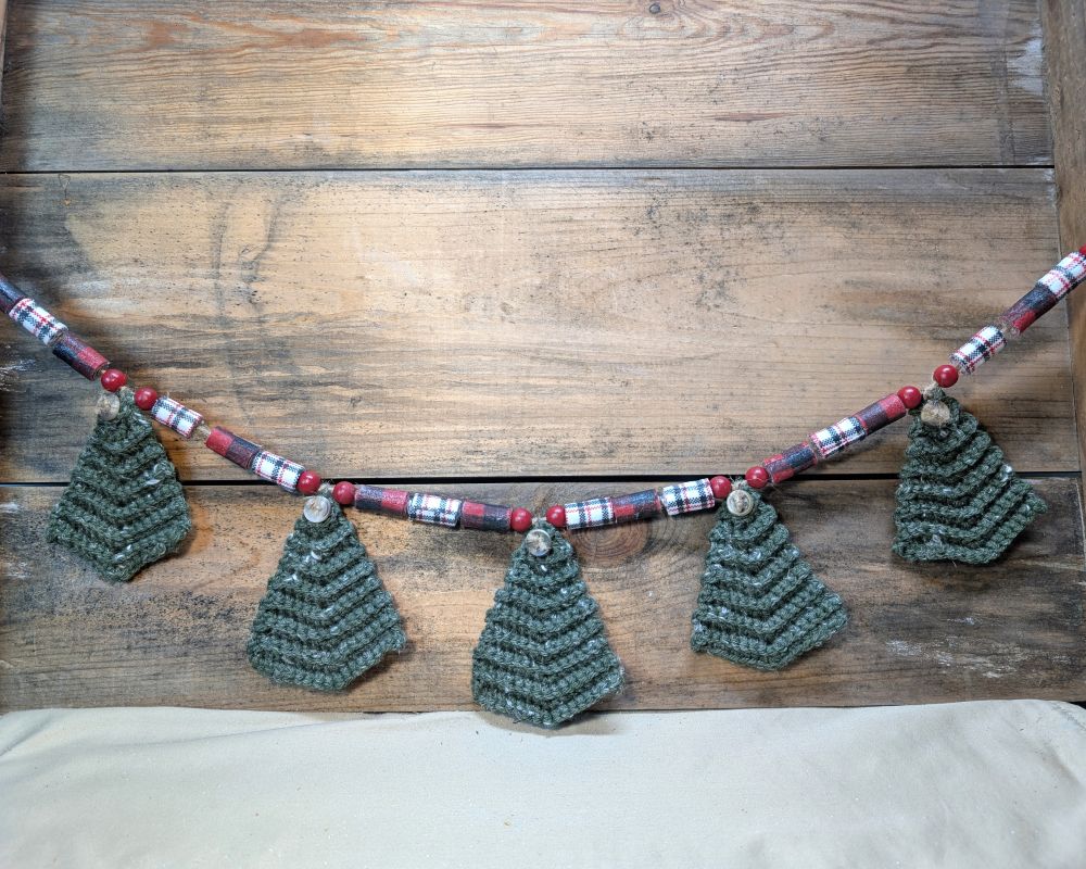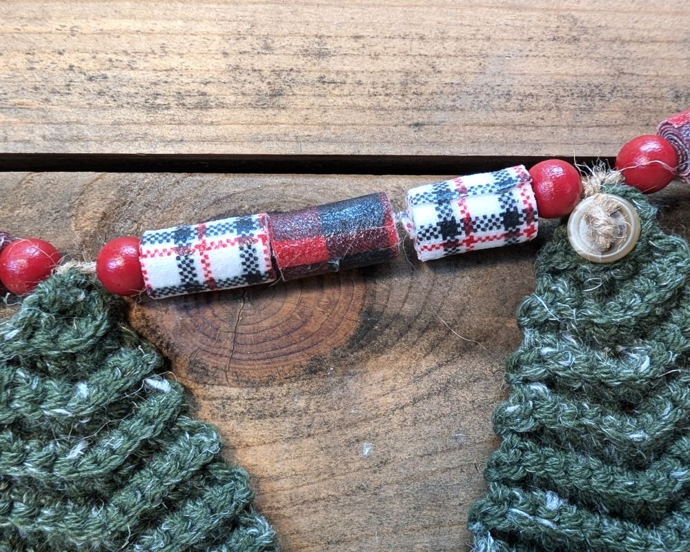 This rustic farmhouse Christmas tree garland will bring plenty of woodland vibes to your home for the Christmas season. It is a 30-inch garland made with five crocheted Christmas trees with a button on each one, red wooden beads, and handmade fabric plaid beads strung on jute twine.
