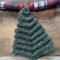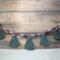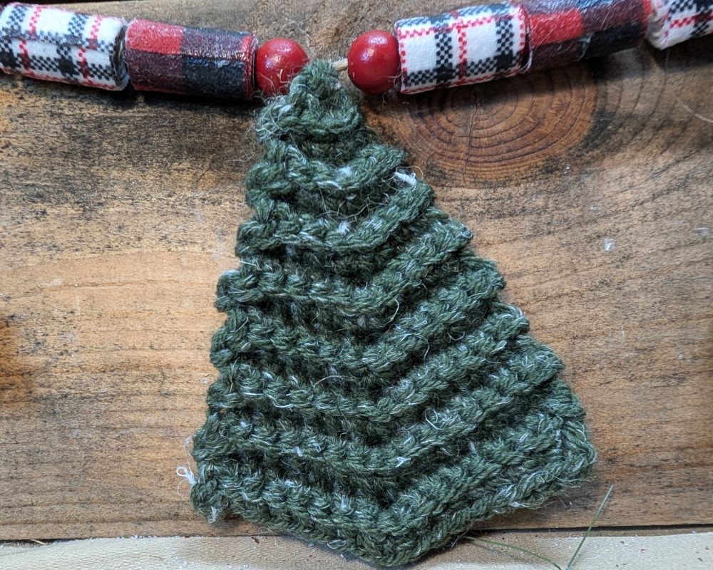 Handmade fabric beads, crocheted Christmas trees, and wood beads are strung on jute twine.