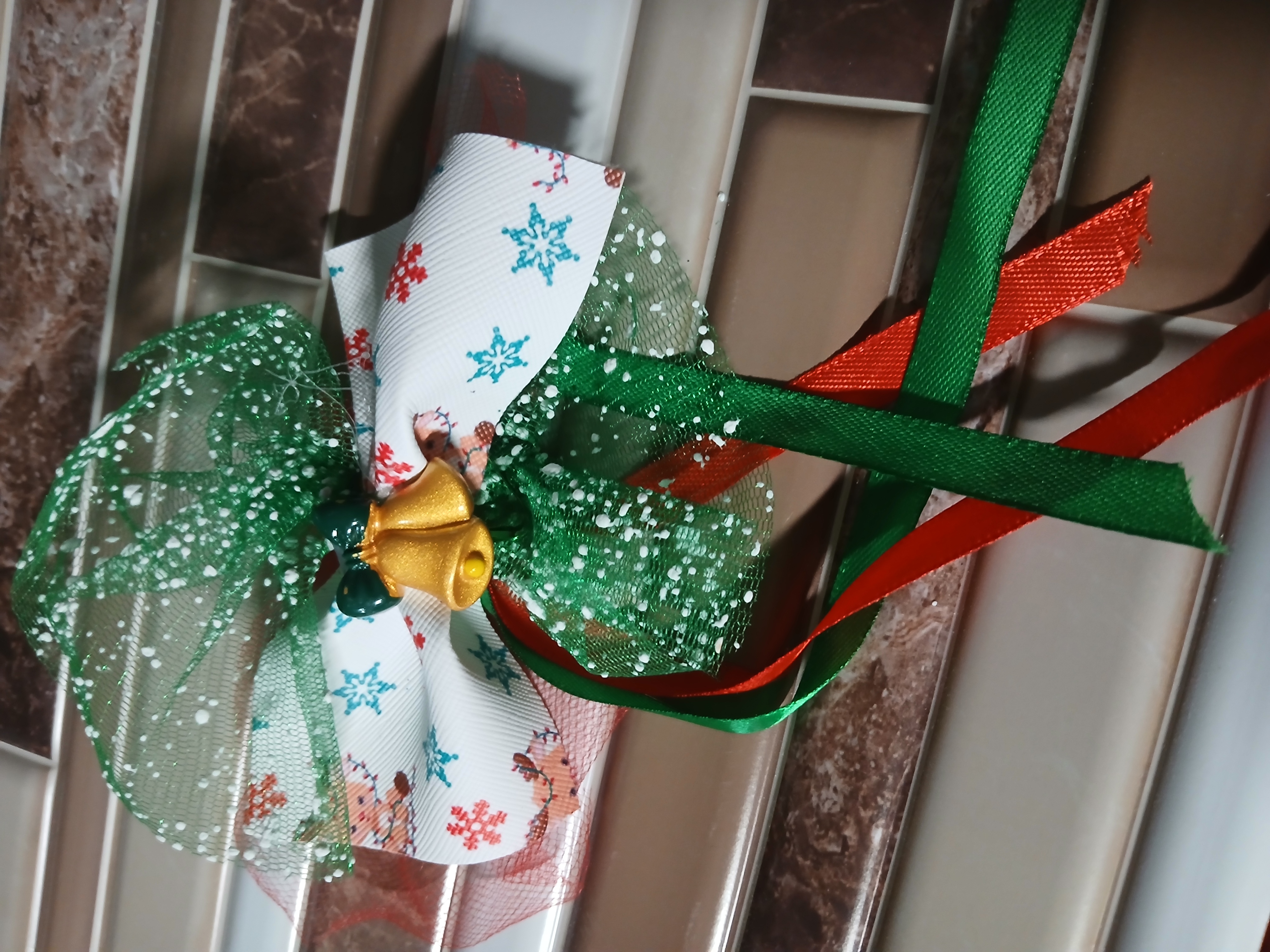This Christmas bow has faux leather with gold bells and green tulle with white and red tulle and green and red ribbon hanging down with snap clip