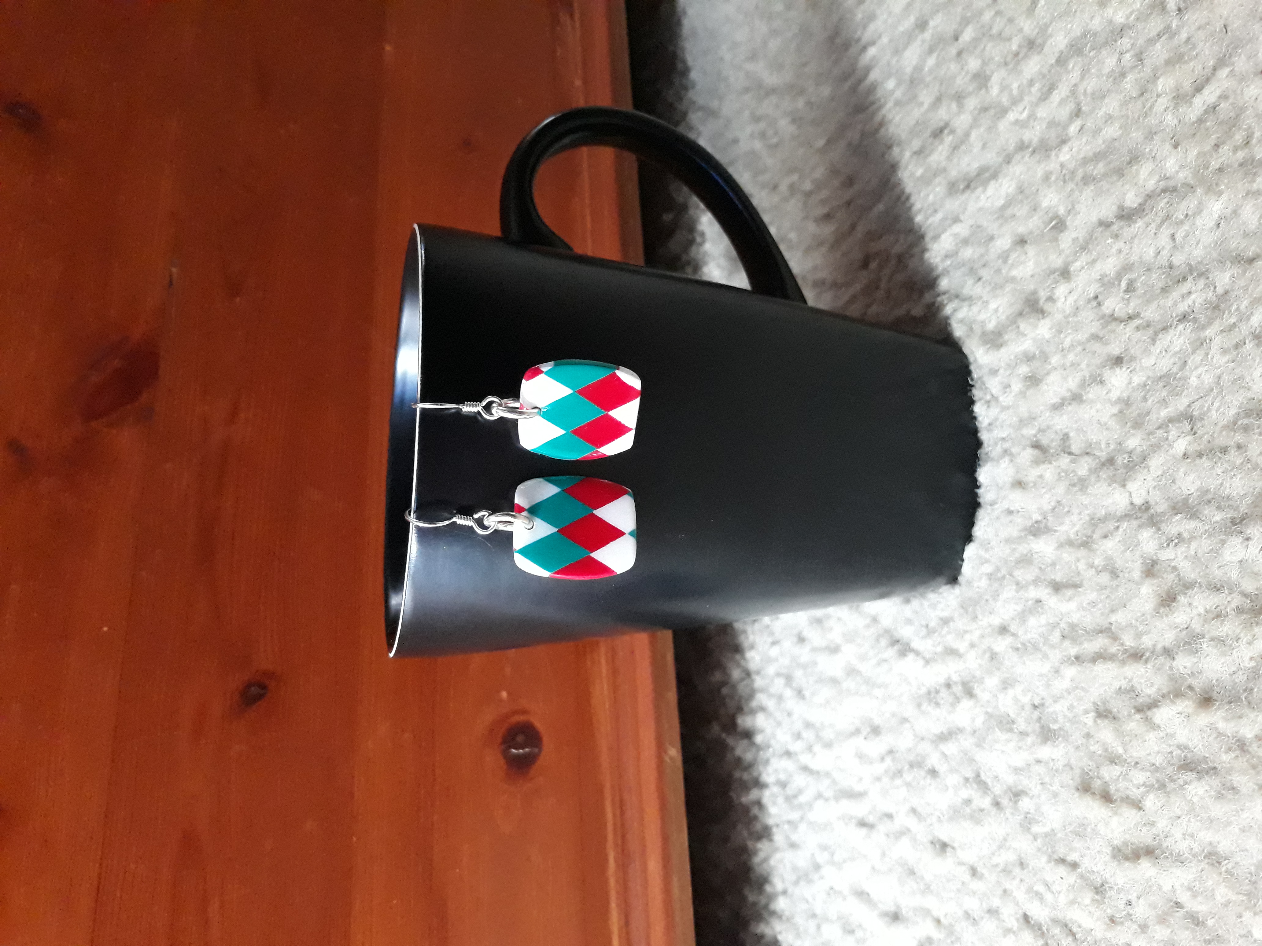 Red, green and white clay pieces together in a harlequin checkerboard pattern. Hung on sterling silver french hooks. Seal-coated with UV resin. Overall size is 1.5 inches (40 mm). These are dainty and very lightweight.