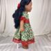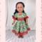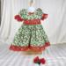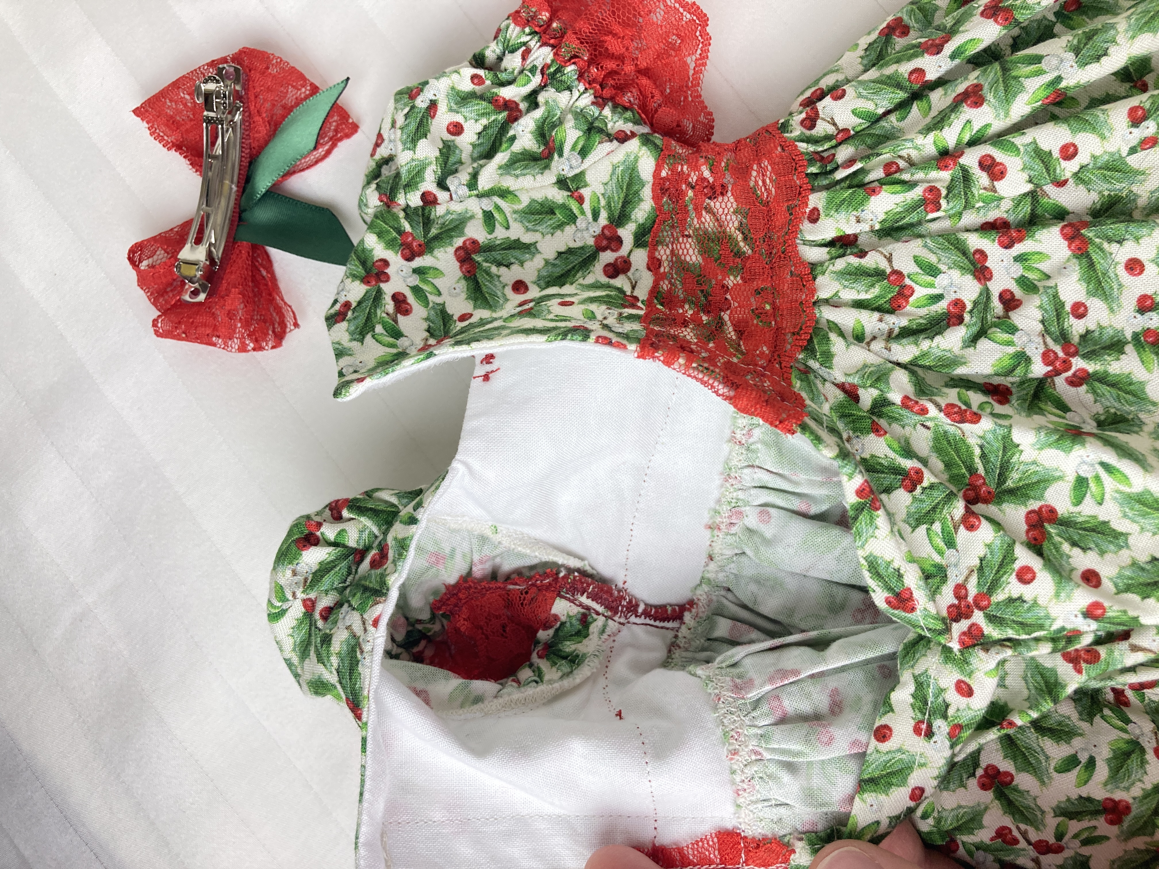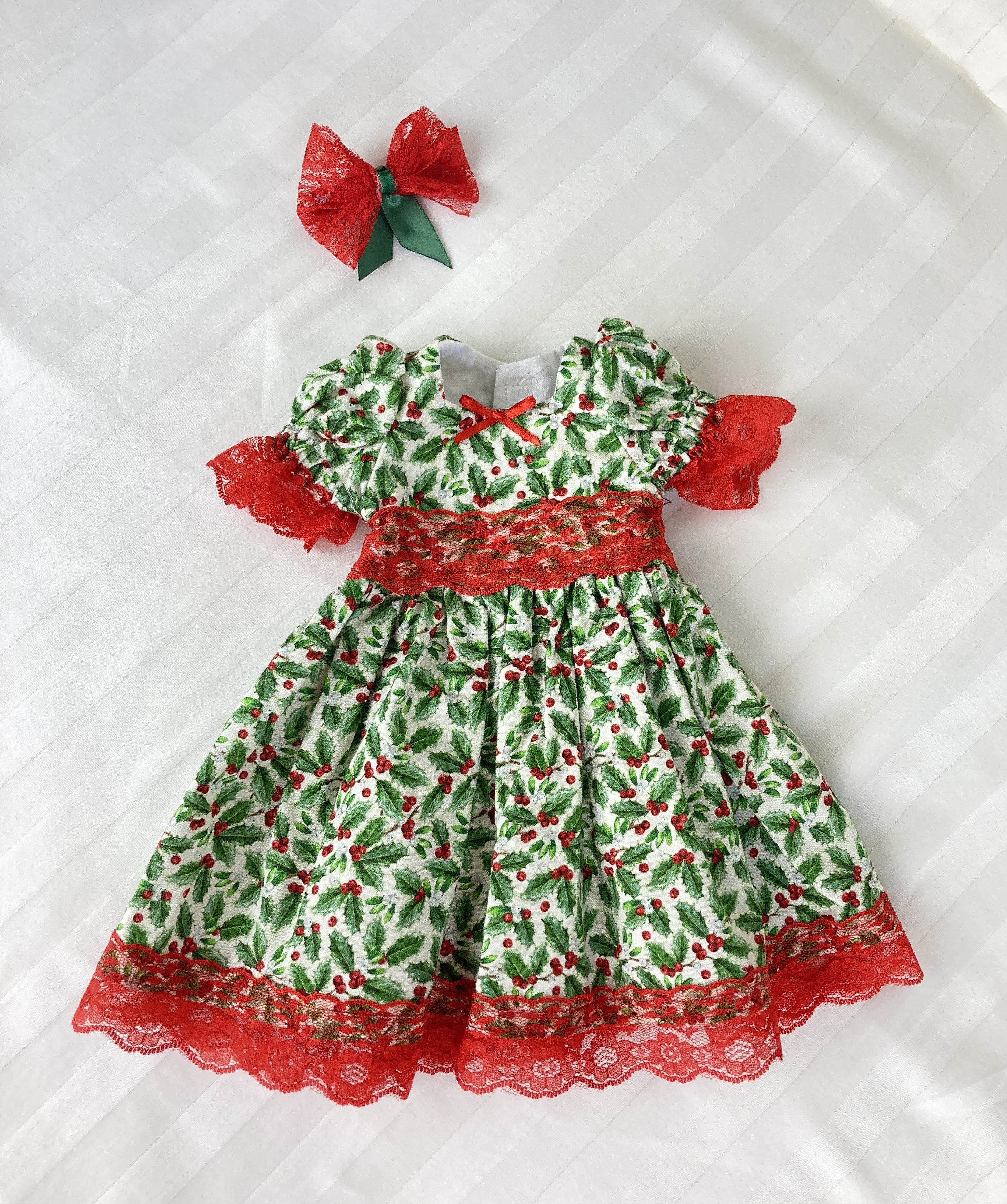 The dress is made from a cotton holly berry print on cream background. The bodice is lined and features a square neckline and puffed sleeves with deep red lace trimming. More red lace encircles the waist and a little red ribbon bow sits in the center of the square neckline. The skirt is full and gathered and falls mid to lower calf and is edged in more of the red lace found on the bodice. The back is a hook and loop closure.