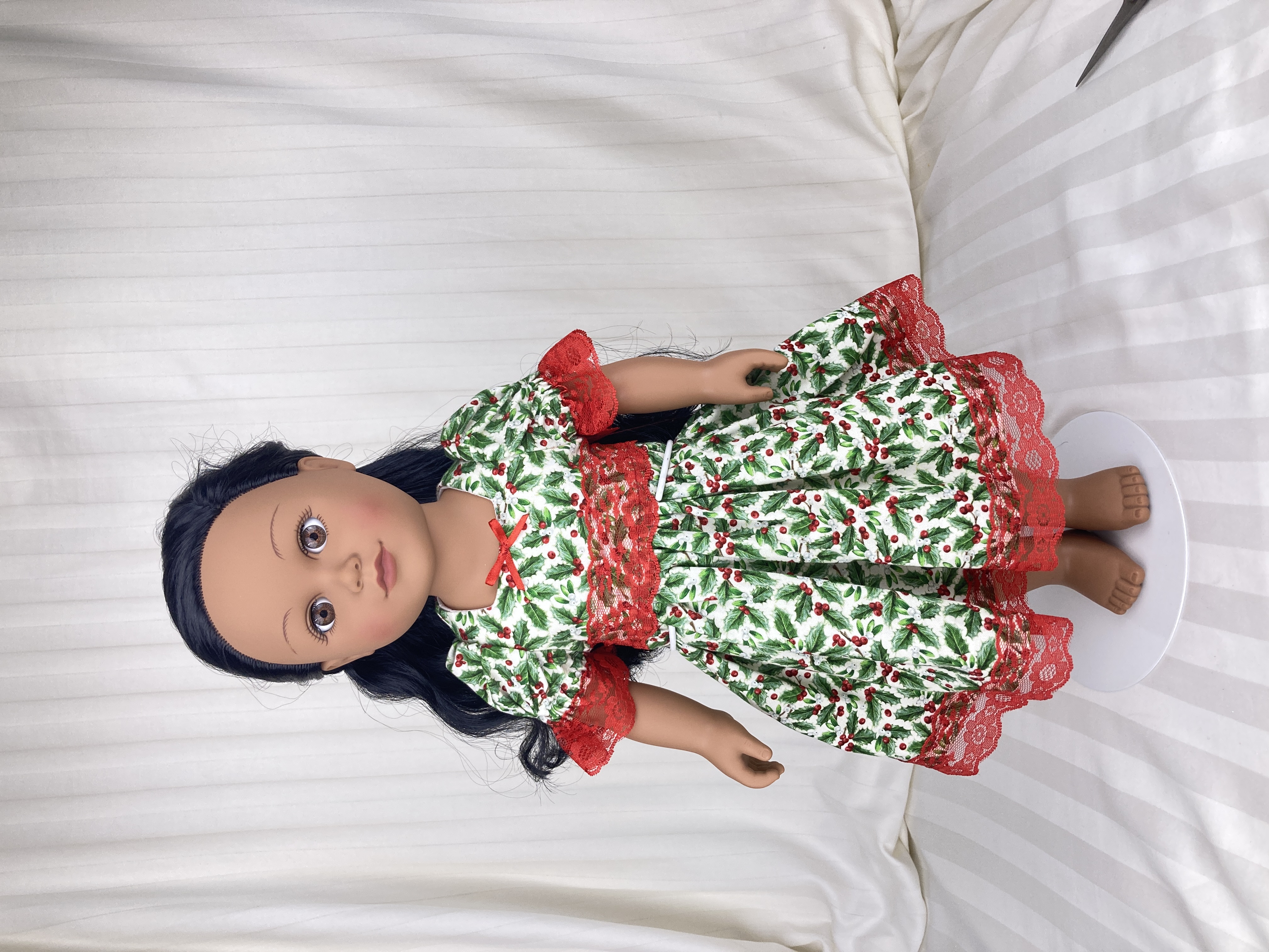 Looking for the perfect Christmas dress for your 18 inch doll? This gorgeous holly berry ensemble features two pieces: a dress and a hairbow barrette.