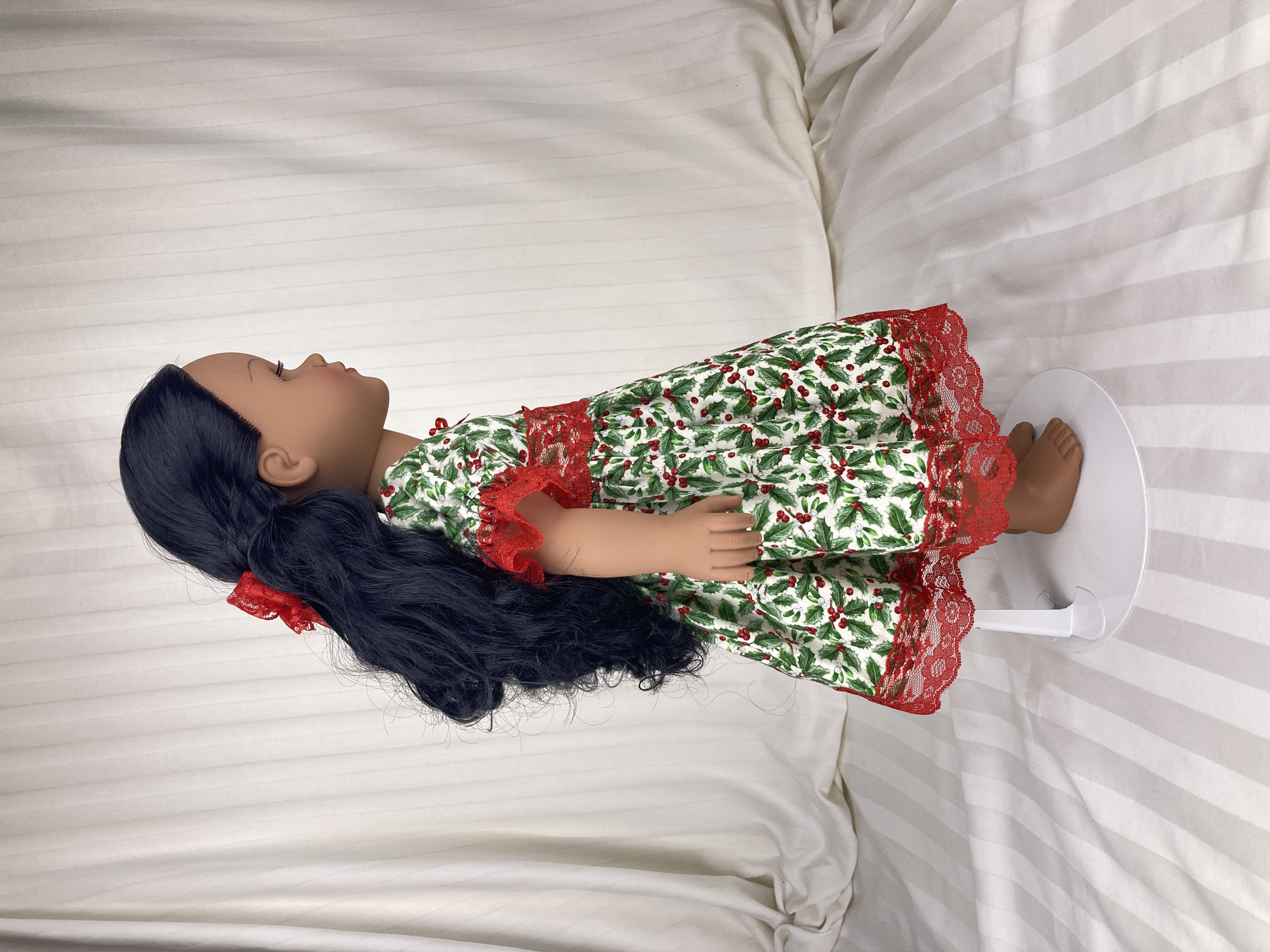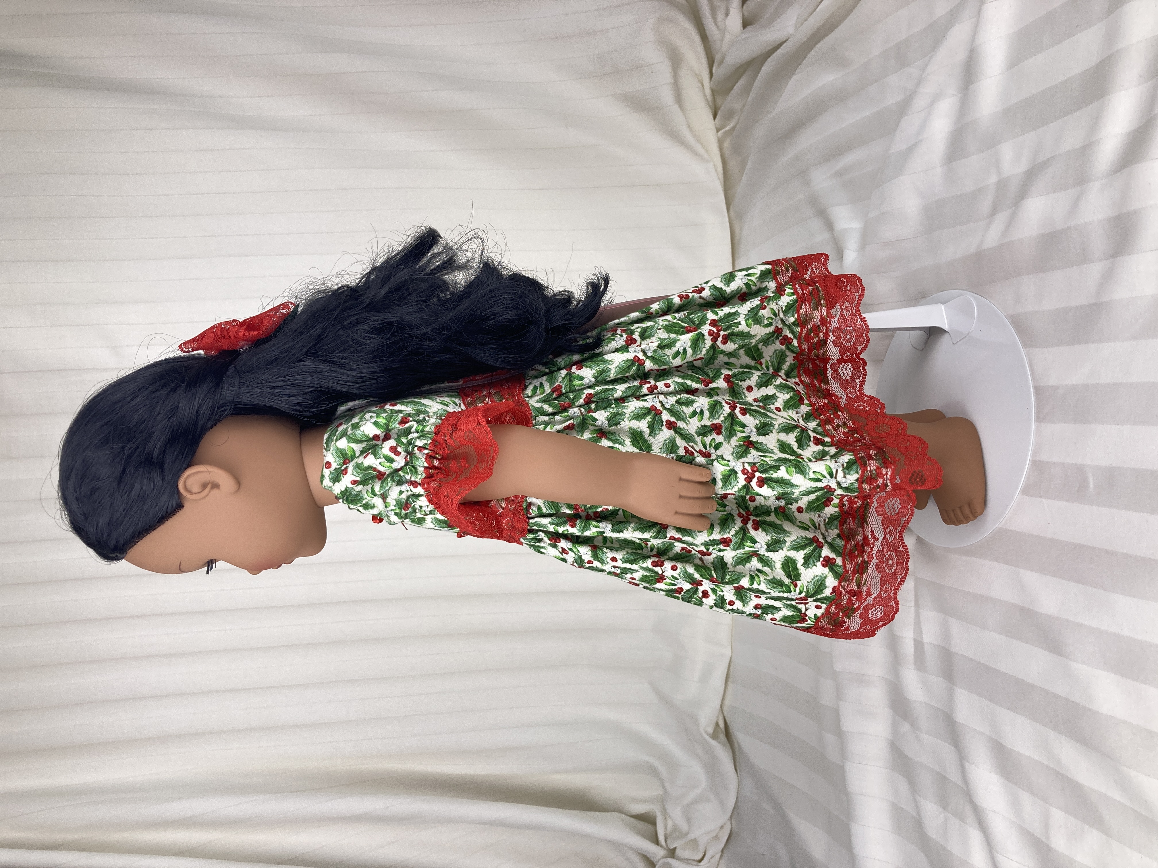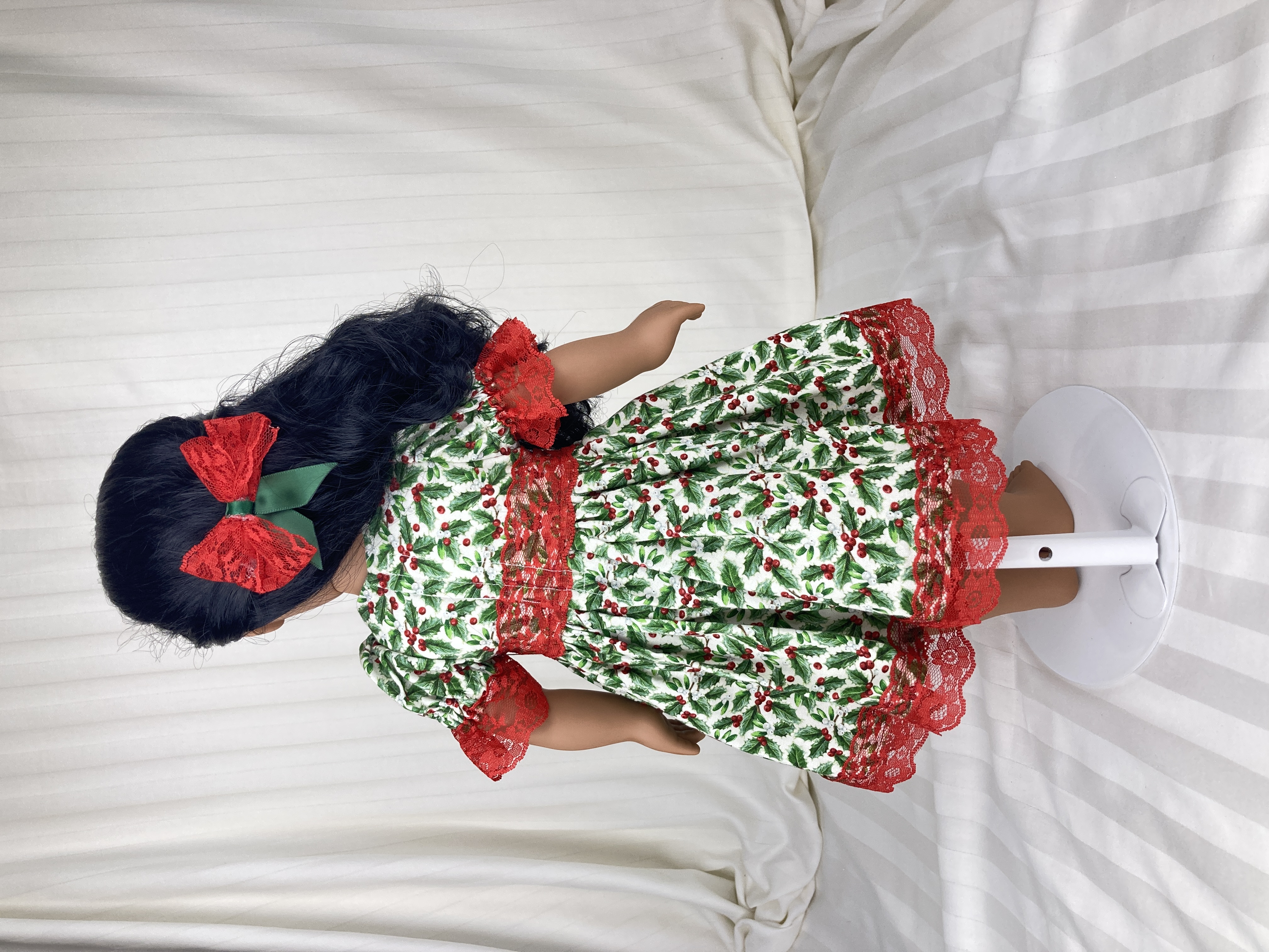 No outfit is complete without a hair piece and this dress is no exception! The hairbow is attached to a barrette and and made from the same red lace as the dress; a green ribbon center with tails brings the hairbow fully into the Christmas spirit.