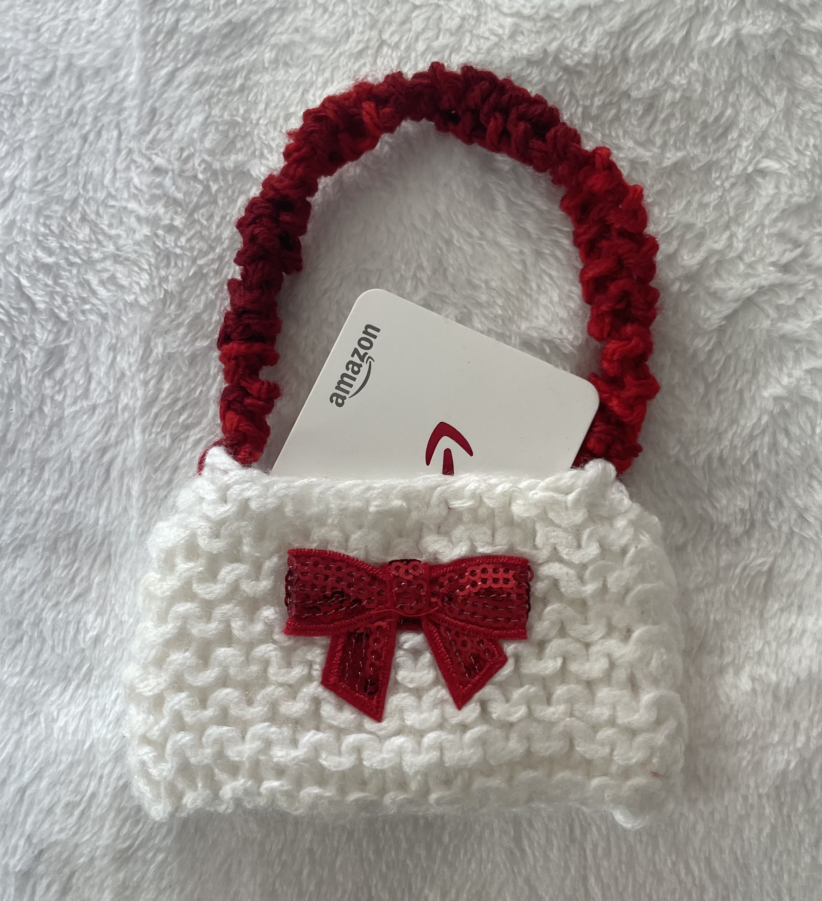 First, I always choose a yarn color that “speaks to me.” Next comes hand knitting the base of the bag followed by adding a strap - also hand knitted. The last step (my favorite) is adding the embellishment! Through the process I imagine the child receiving this doll accessory. That always puts a big smile on my face, and Christmas knitting is the best! Enjoy❣️