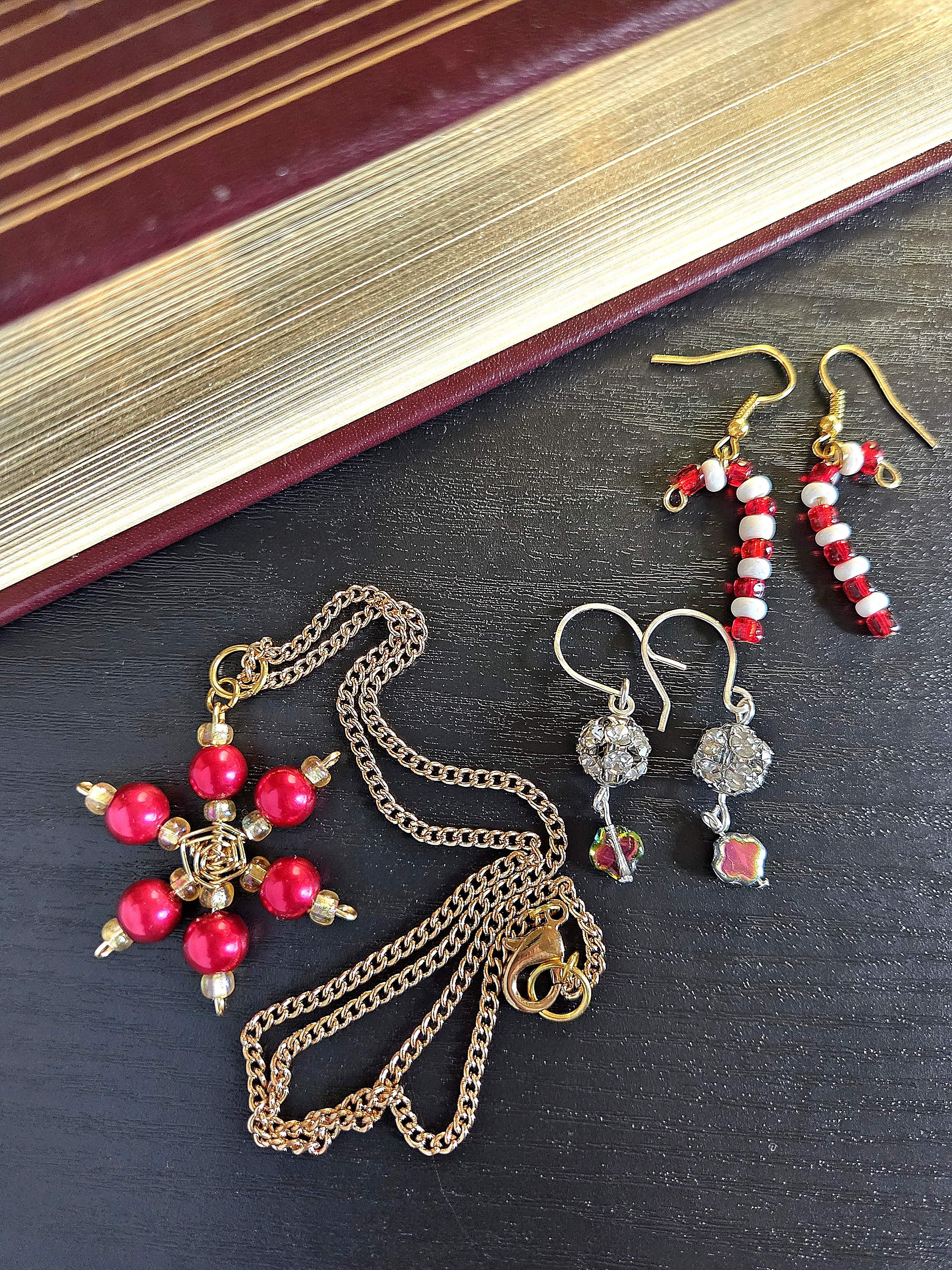 Celebrate the entire holiday season with this handmade Christmas jewelry gift set, featuring three festive designs perfect for gifting or wearing all season long. The set includes a gold wire-wrapped snowflake pendant accented with red pearls and gold beads on a matching gold chain, a playful pair of candy cane earrings for classic Christmas cheer, and sparkling disco ball earrings finished with a multi-colored star bead to ring in the New Year. Each piece is carefully handcrafted with attention to detail, blending elegant holiday charm with fun, celebratory sparkle. This unique jewelry set makes a thoughtful Christmas gift, stocking stuffer, or New Year’s accessory for anyone who loves handmade holiday jewelry with personality and shine.
