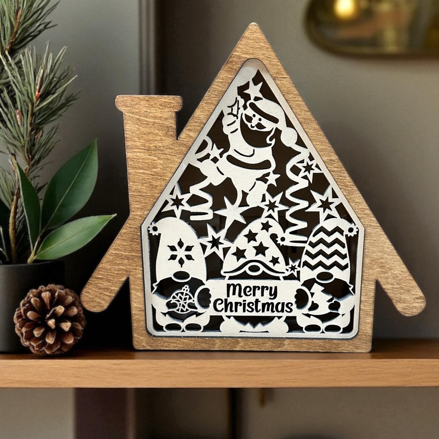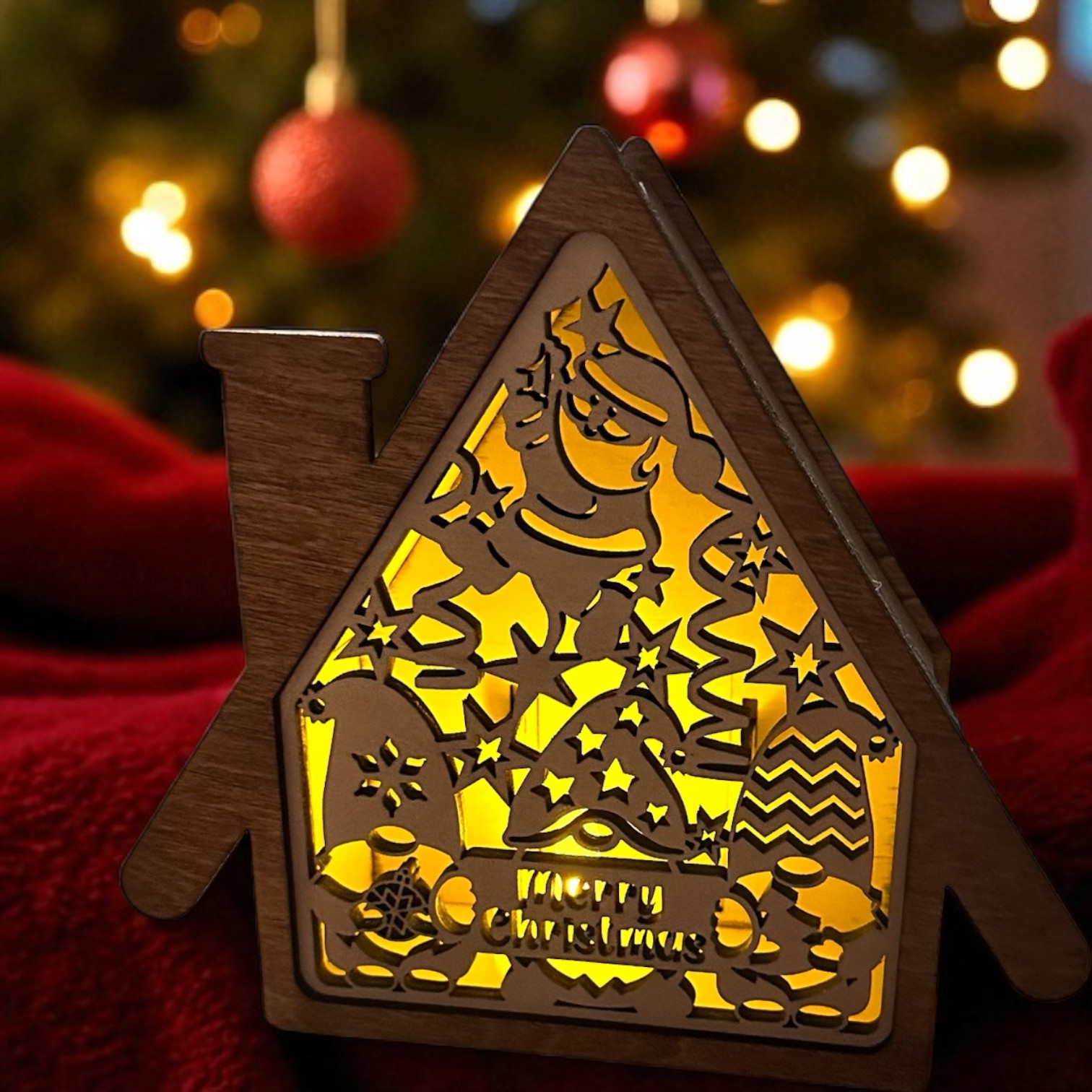 Bring the magic of Christmas to life with this charming laser-cut wooden lantern in the shape of a cozy house. Each front is beautifully detailed with festive scenes—elves busily decorating or children joyfully trimming the tree—capturing the warmth of the season. A battery-operated tea light is included, casting a soft glow through the intricate cutouts and creating a heartwarming holiday ambiance for your home.