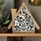 Each piece that makes up the lantern is precisely cut with a laser. Then each piece is stained or painted before adhered together. The backside has a removable hatch for easy access to the light.