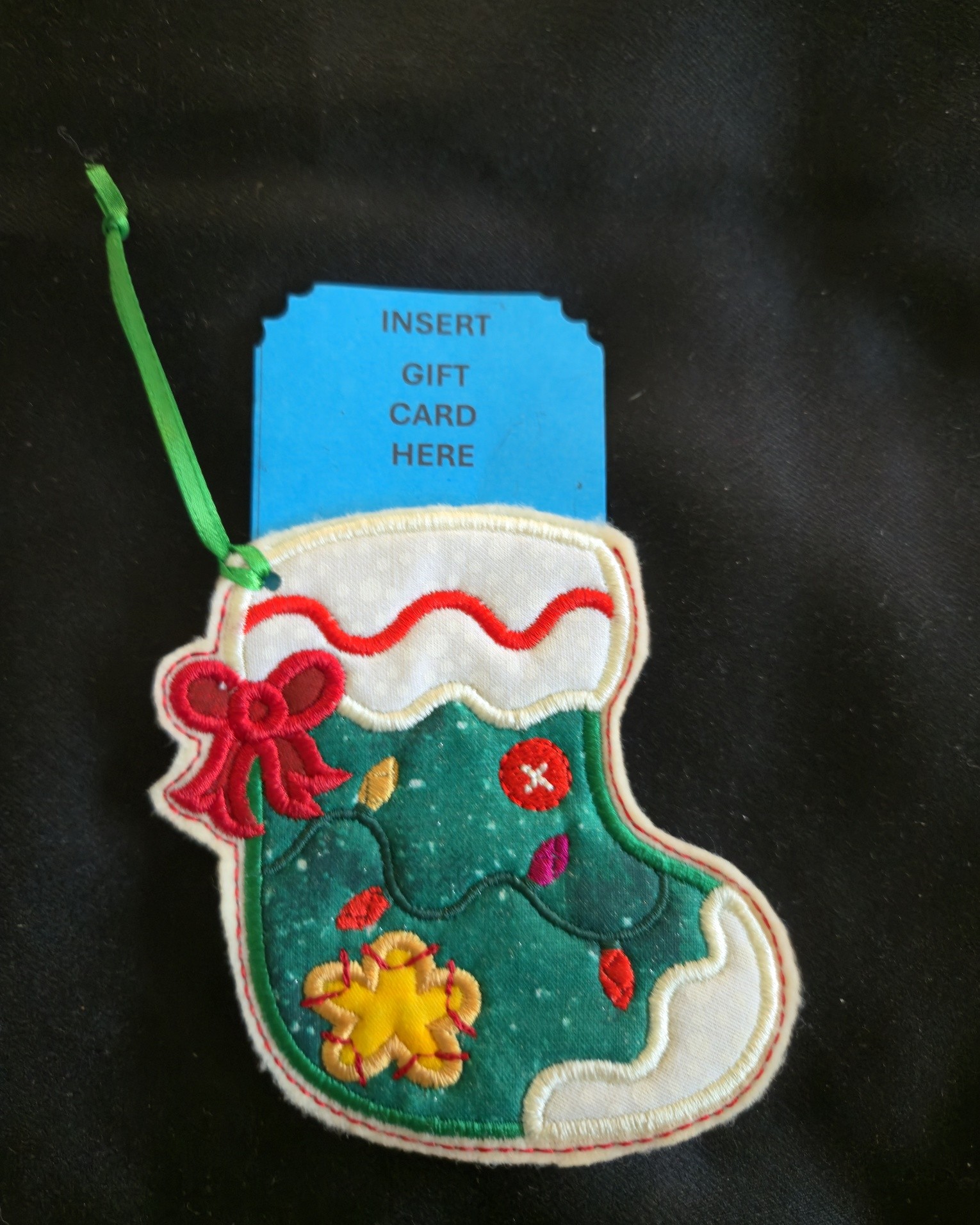 This item combines both fabric, thread, and appliqued to create unique embroidered gift card holders to hang on Christmas trees or in stockings.