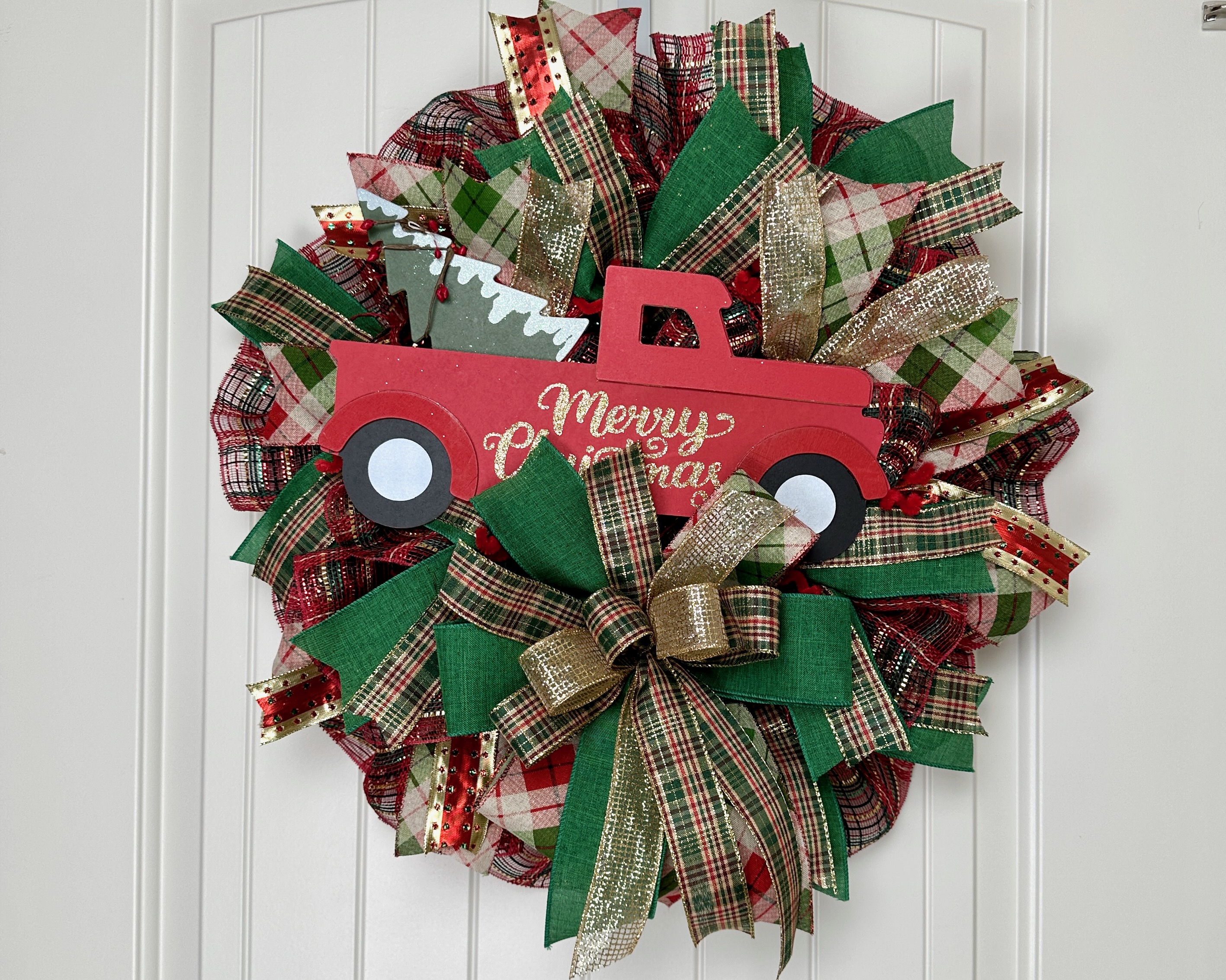 This simple traditional Red, Green and gold Christmas Wreath features the iconic Red Truck with a Merry Christmas lettered sign.