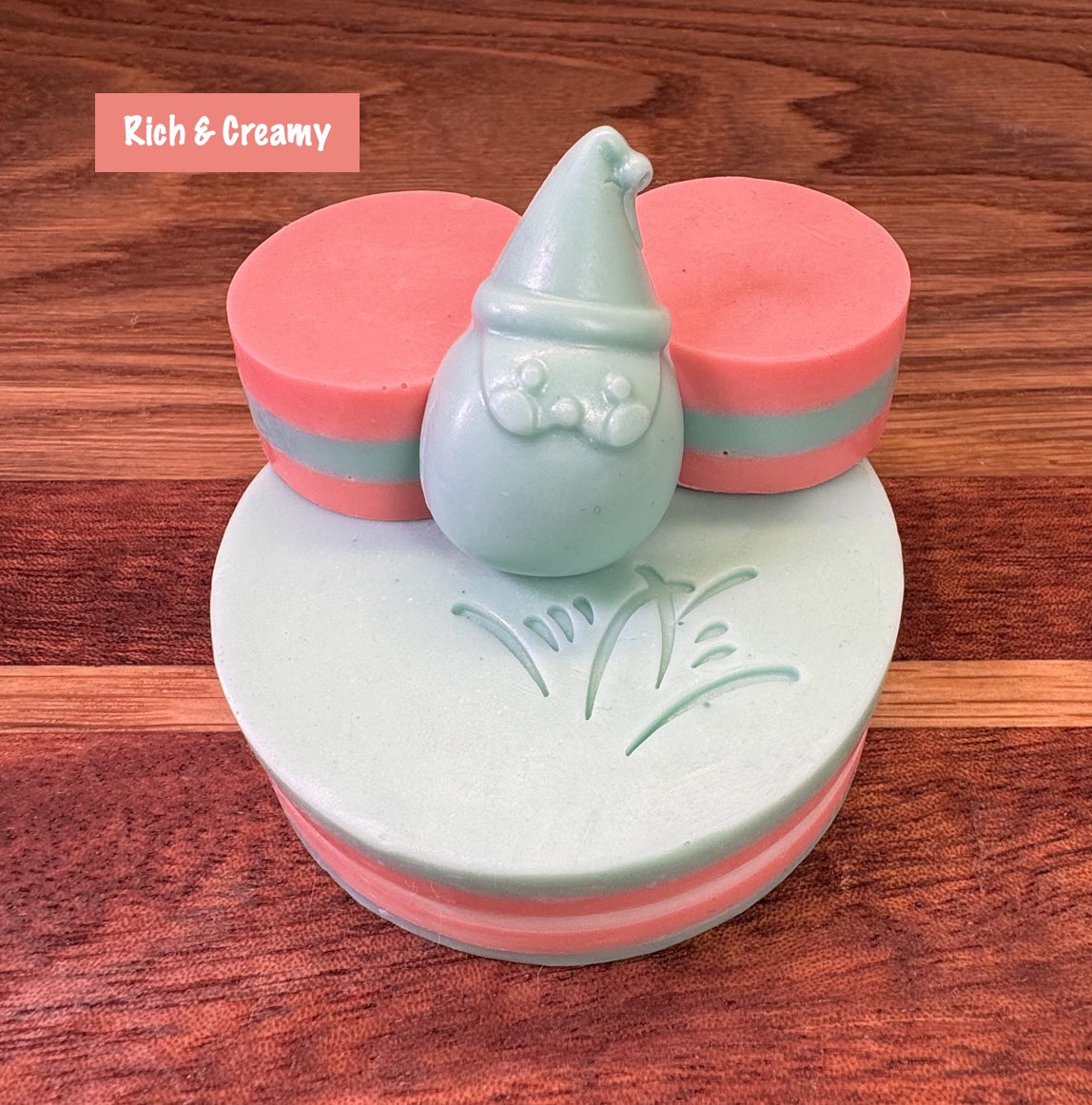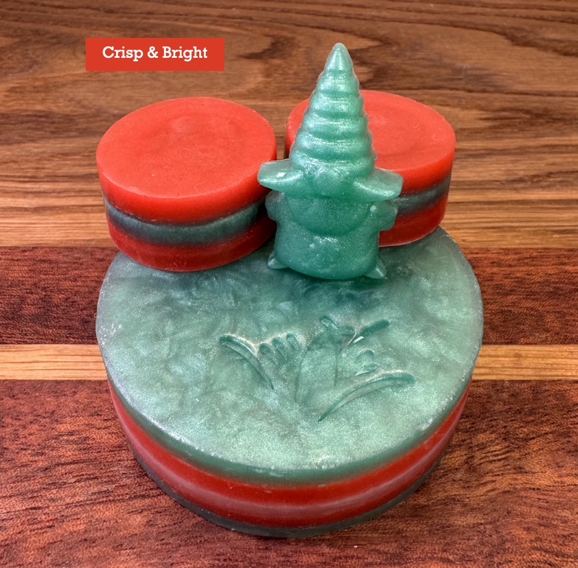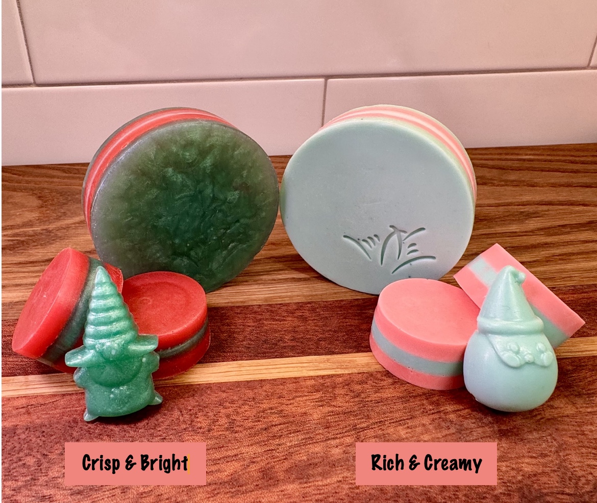 Secret Santa is hiding in each Full-sized pour. These fun pours are great for adding a little Christmas to your bath. Drop a bar into a stocking or treat yourself to a little holiday fun. Need a White Elephant gift or are you someone's secret Santa? We've got you covered! Santa will slowly emerge as the outer layers nourish your skin. These pours are made for everyday use as a bath and body bar, or for refreshing shampoo or shave.