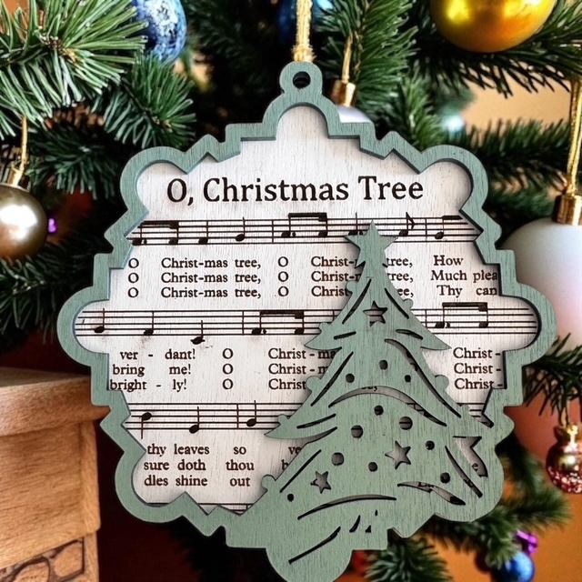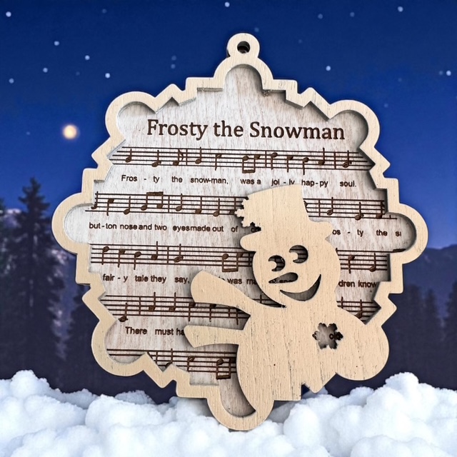 Each ornament is carefully crafted from two layers of wood that are laser cut and engraved for precision and detail. The base layer features the engraved lyrics or sheet music of a beloved Christmas song, while the top layer is intricately cut to depict a scene or symbol inspired by the tune. Select elements are hand-painted to add color and depth, while others are stained to enhance the natural beauty of the wood. The two layers are then perfectly aligned and adhered together, creating a dimensional ornament that blends craftsmanship, artistry, and the timeless joy of Christmas music.