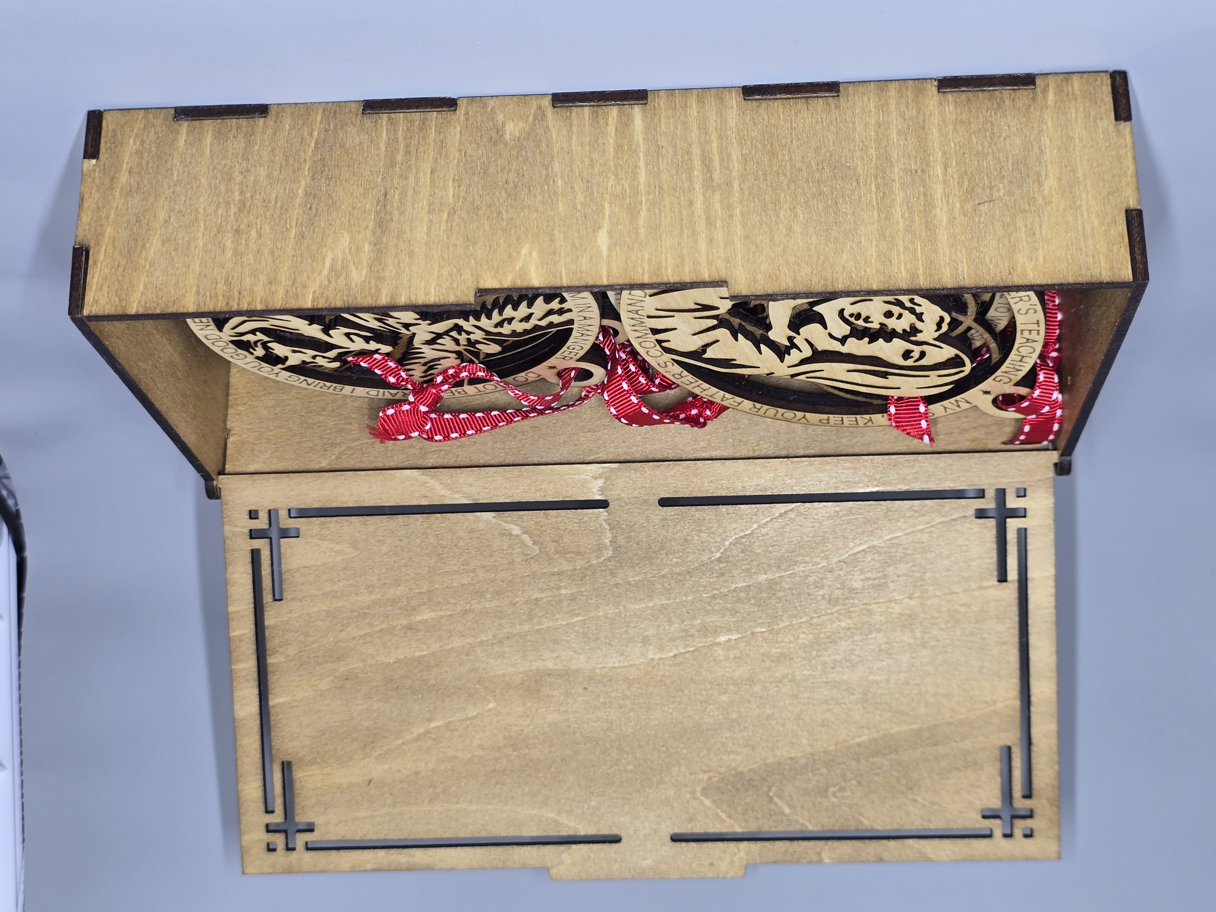 Each laser-cut piece is carefully created, stained, fitted together, and sealed to create the stunning 3-D ornaments. The top of the box has cut-outs and is engraved with "The Christmas Story A Savior is Born" on it. The box is lovingly sanded and stained both inside and out, and then sealed to make it last.