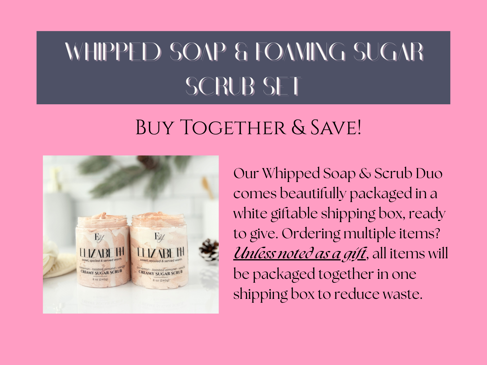 Get the best of both worlds! Pair the whipped soap and sugar scrub for the ultimate self-care ritual and enjoy special bundle savings.