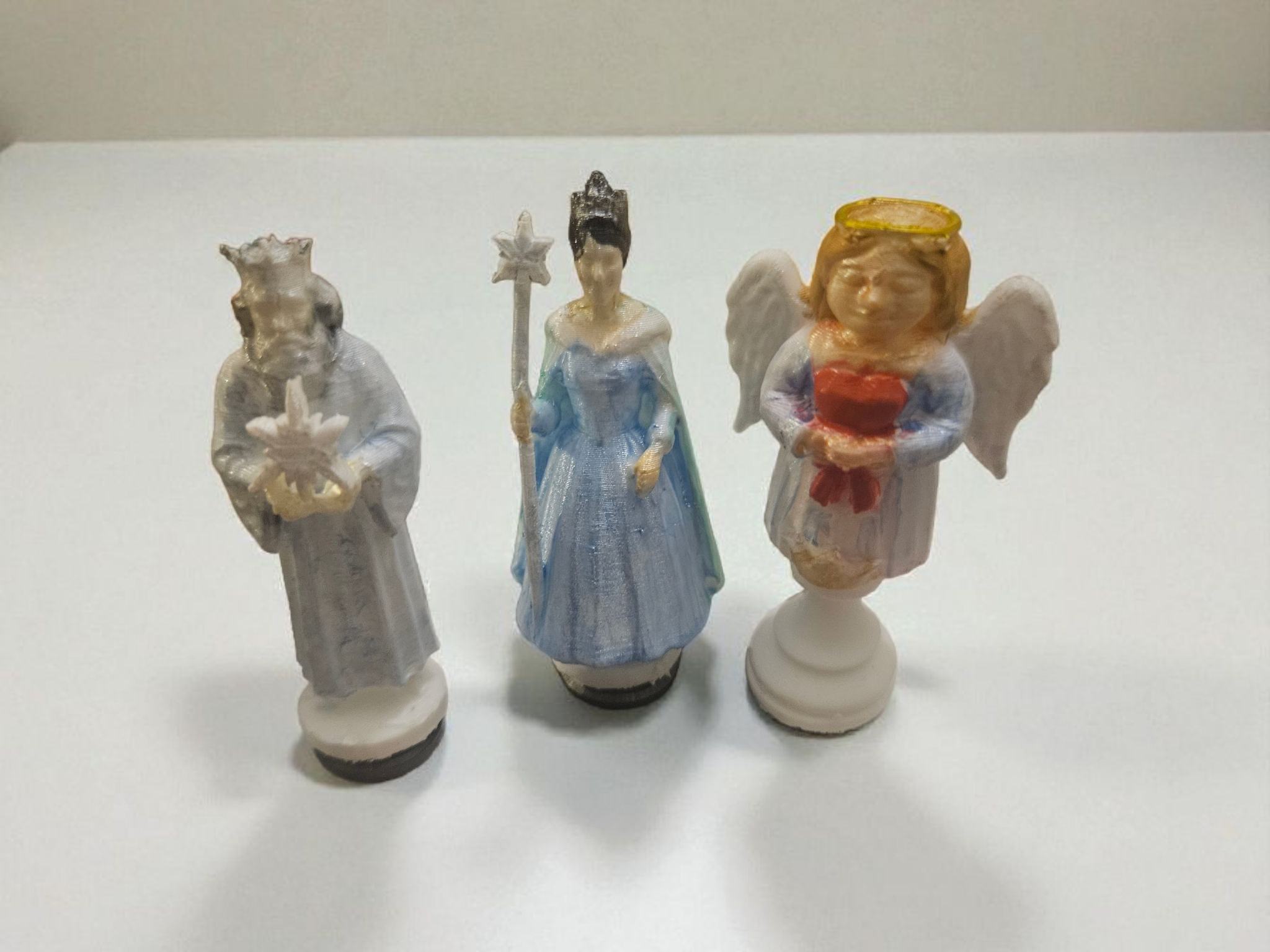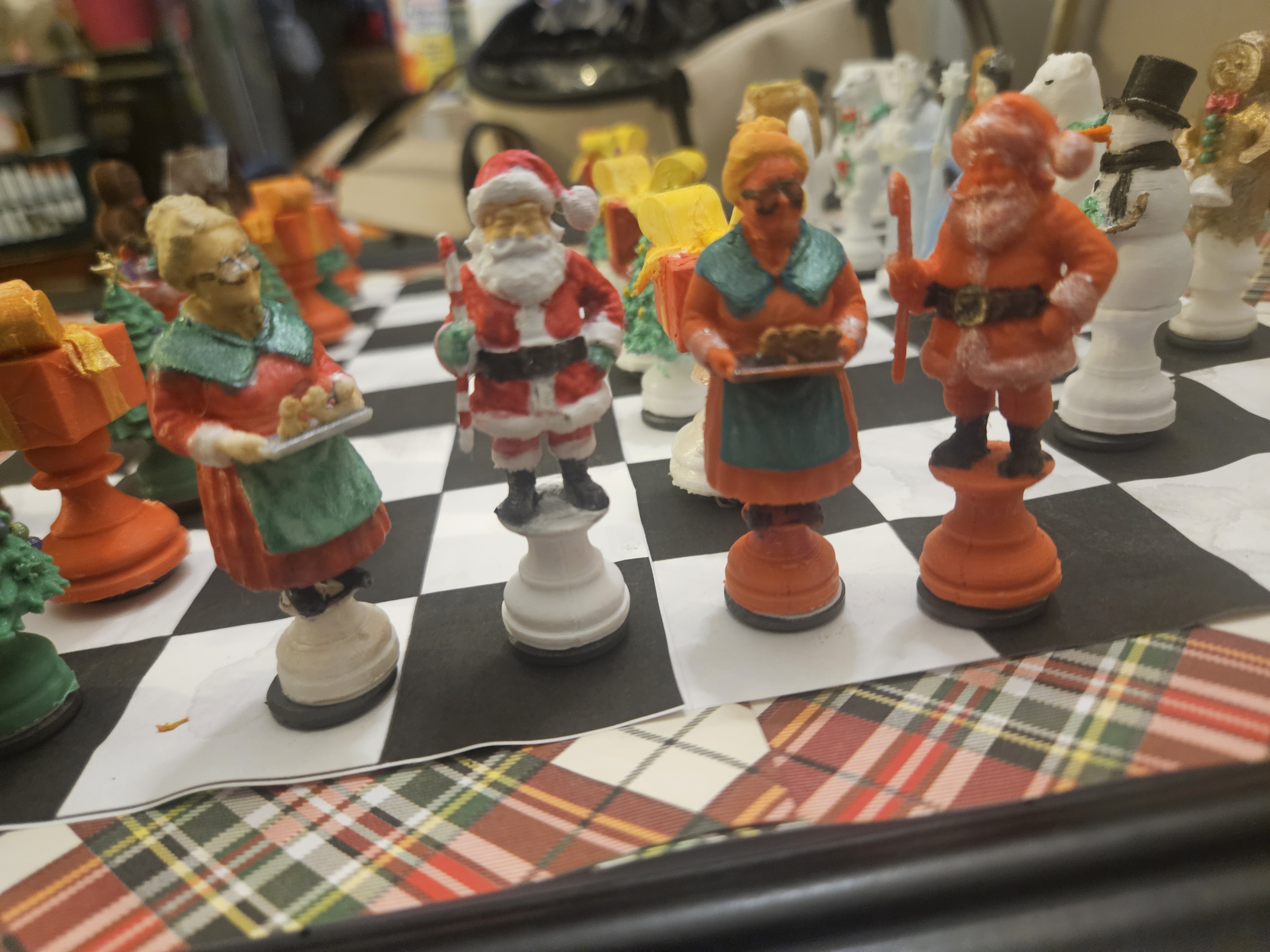I custom-designed each piece on my computer using 3D modeling software or through 3D prompts. I then print them out on my 3D printer. The pieces are hand-painted to fit the theme. I design and print the chessboards to match the theme of the set. I apply the board along with a complementary design element to a hard surface.