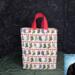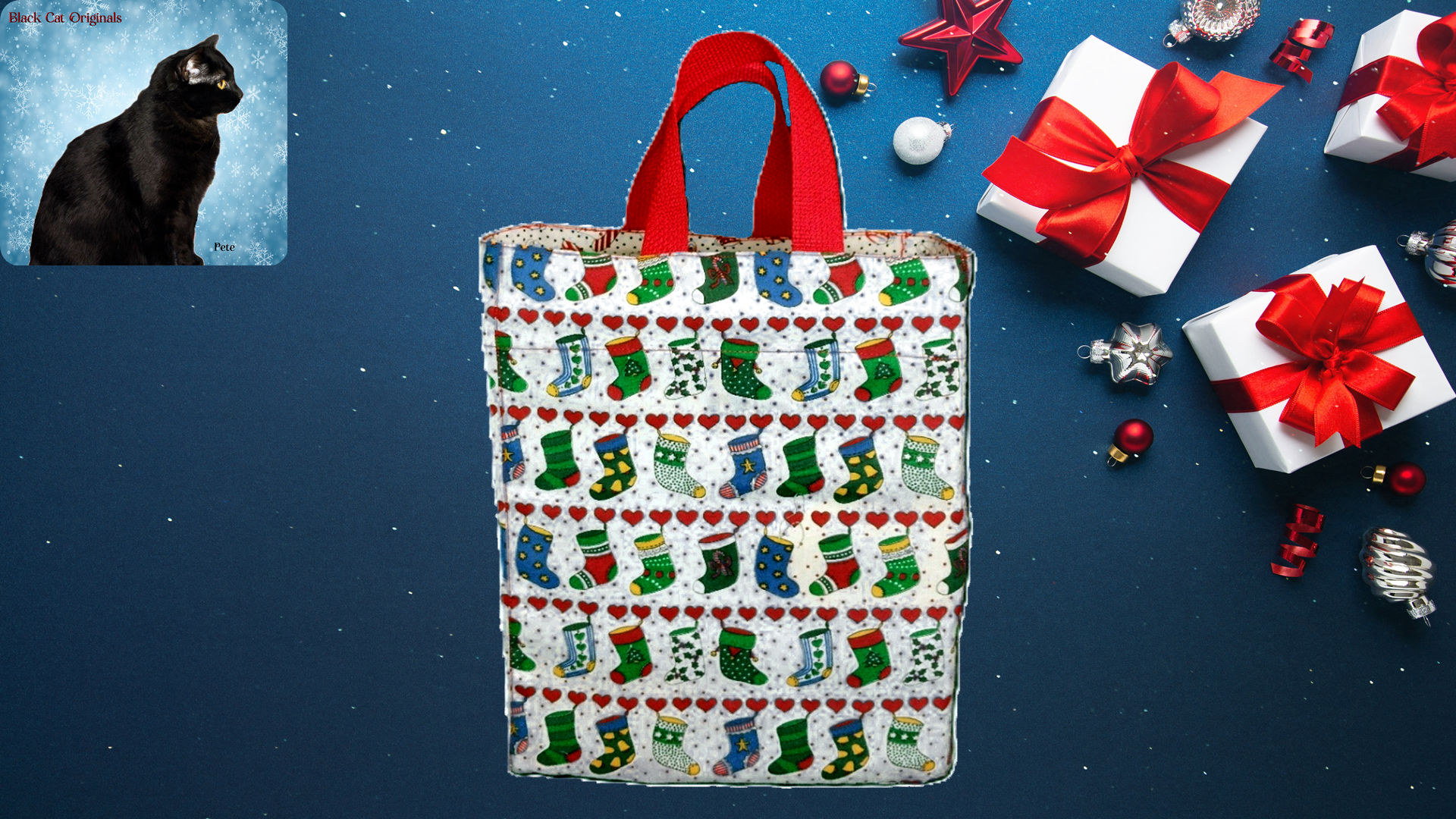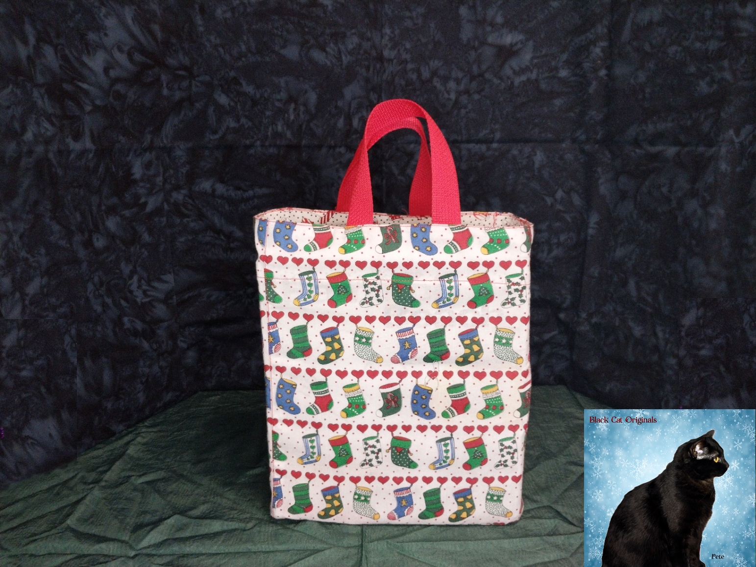 These are small totes with fun Christmas themes! The bags are constructed of 100% cotton except for the nylon handles. Please note: these bags are not lined like my Halloween bags, but just as sturdy and reusable. The bags measure 11 inches tall by 9 inches wide and 4 inches deep. Just the right size for small gifts. Handles and bands vary.