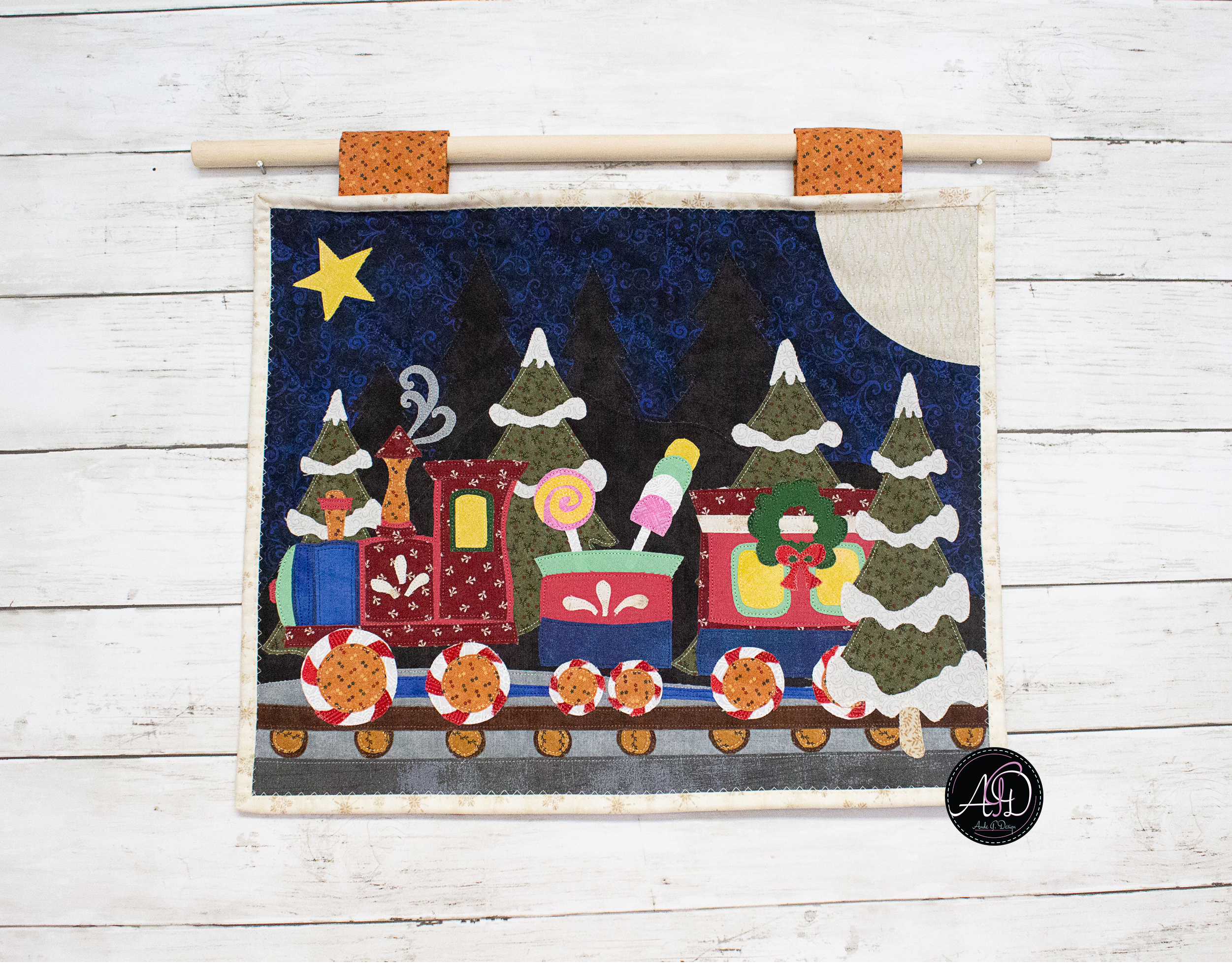 This Snowbell Hollow wall hanging captures a festive Christmas train on its way from the North Pole, glowing windows shining bright as it rolls past snowcapped trees, complete with candy lollipops, gumdrops, a cheerful wreath, and peppermint wheels beneath a moonlit sky filled with stars. Each detail invites a feeling of togetherness and quiet holiday celebration! Handcrafted with smiles, this piece is designed for those who love decorating with intention and story. The raw-edge appliqué is personally designed and cut, framed by a cream border, with a matching backing (same fabric as the background!). Finished with brown sewn-in hanging sleeves, it’s ready to bring handmade joy to your holiday home year after year!