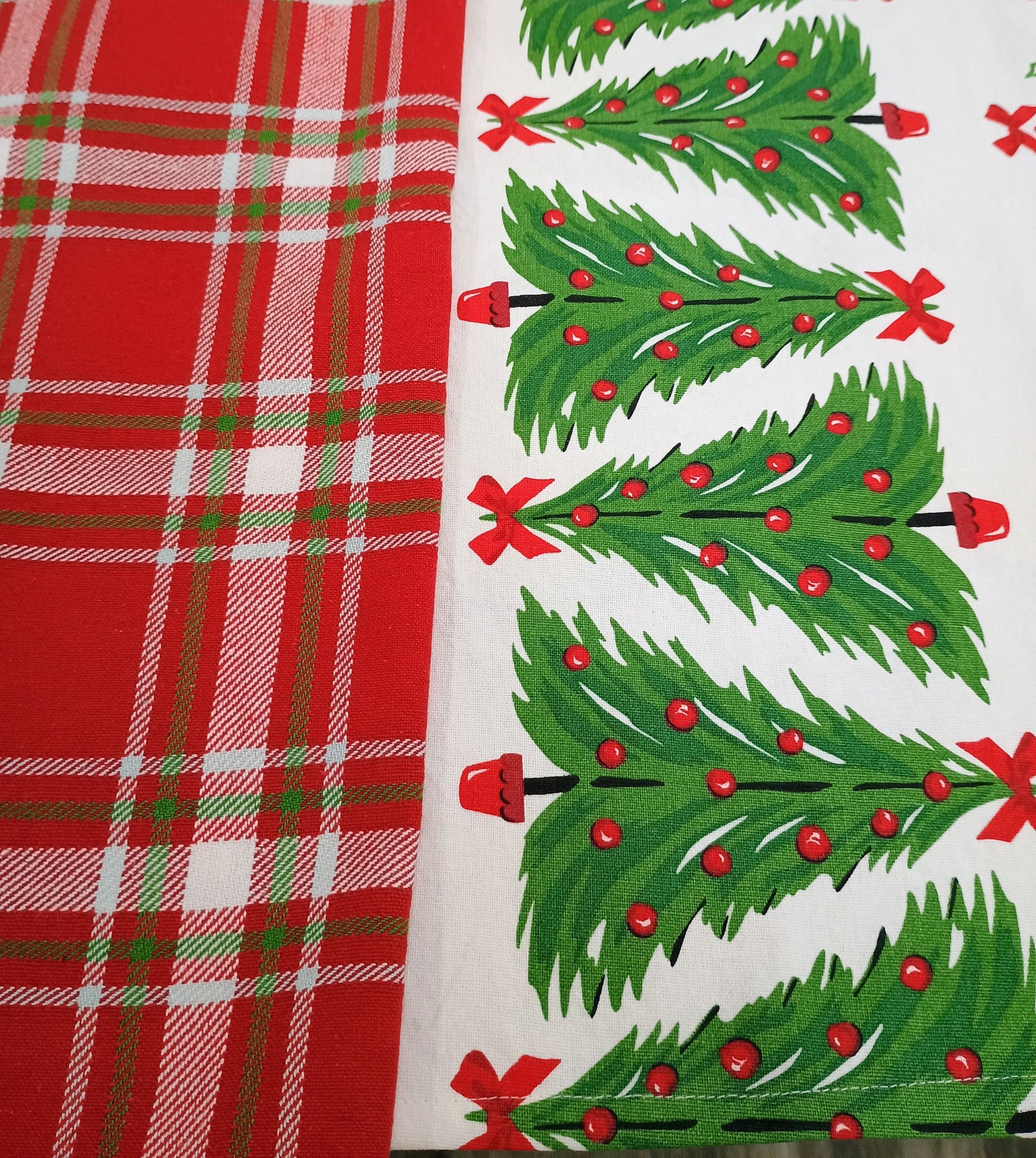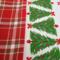 This is cotton toweling with the great trees down the center and edged in a bright Christmas reddown the edges. The middle has a great big trees with tows. This print is just the cutest.