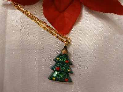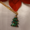 Green Christmas tree charm with red and yellow ornaments on a gold chain with magnetic closer