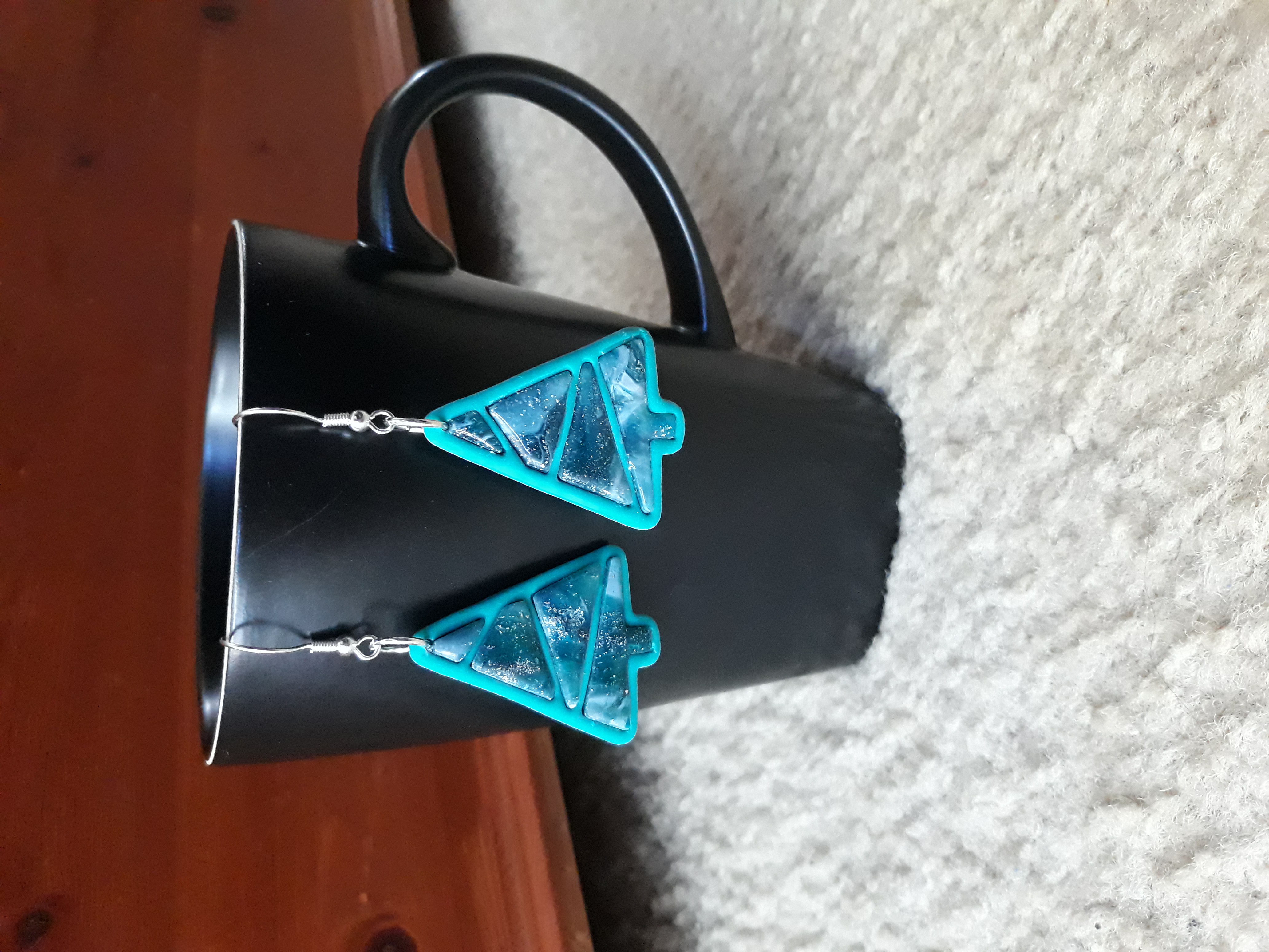 Polymer clay in a spruce green was rolled out and cut into simple tree shapes with abstract cut-out pieces. A variety of leftover clay in blue, green, and gray was rolled and cut into the shapes to fill the trees. The smaller pieces were then coated with UV resin, glued into the trees and assemble into earrings.