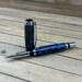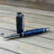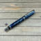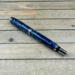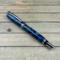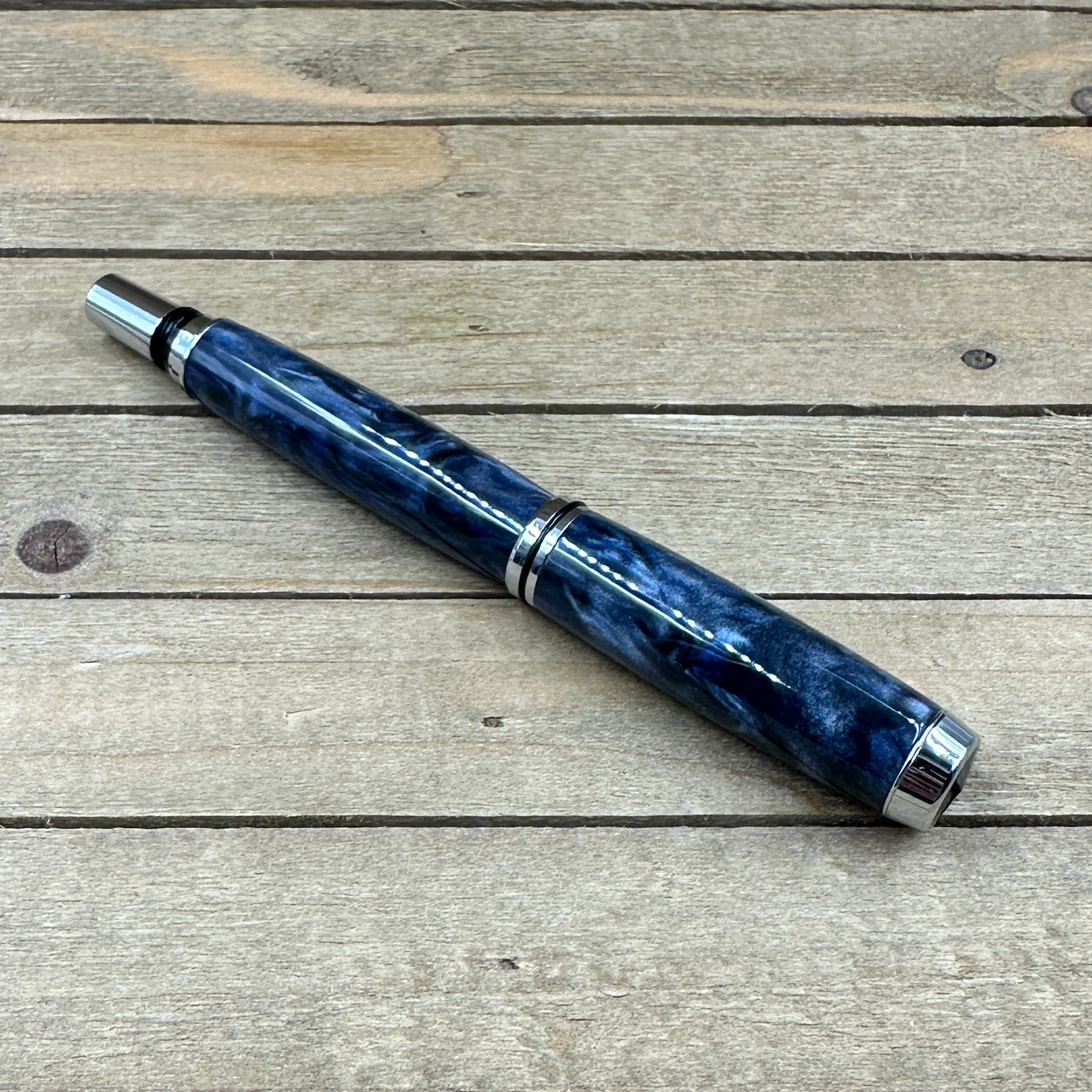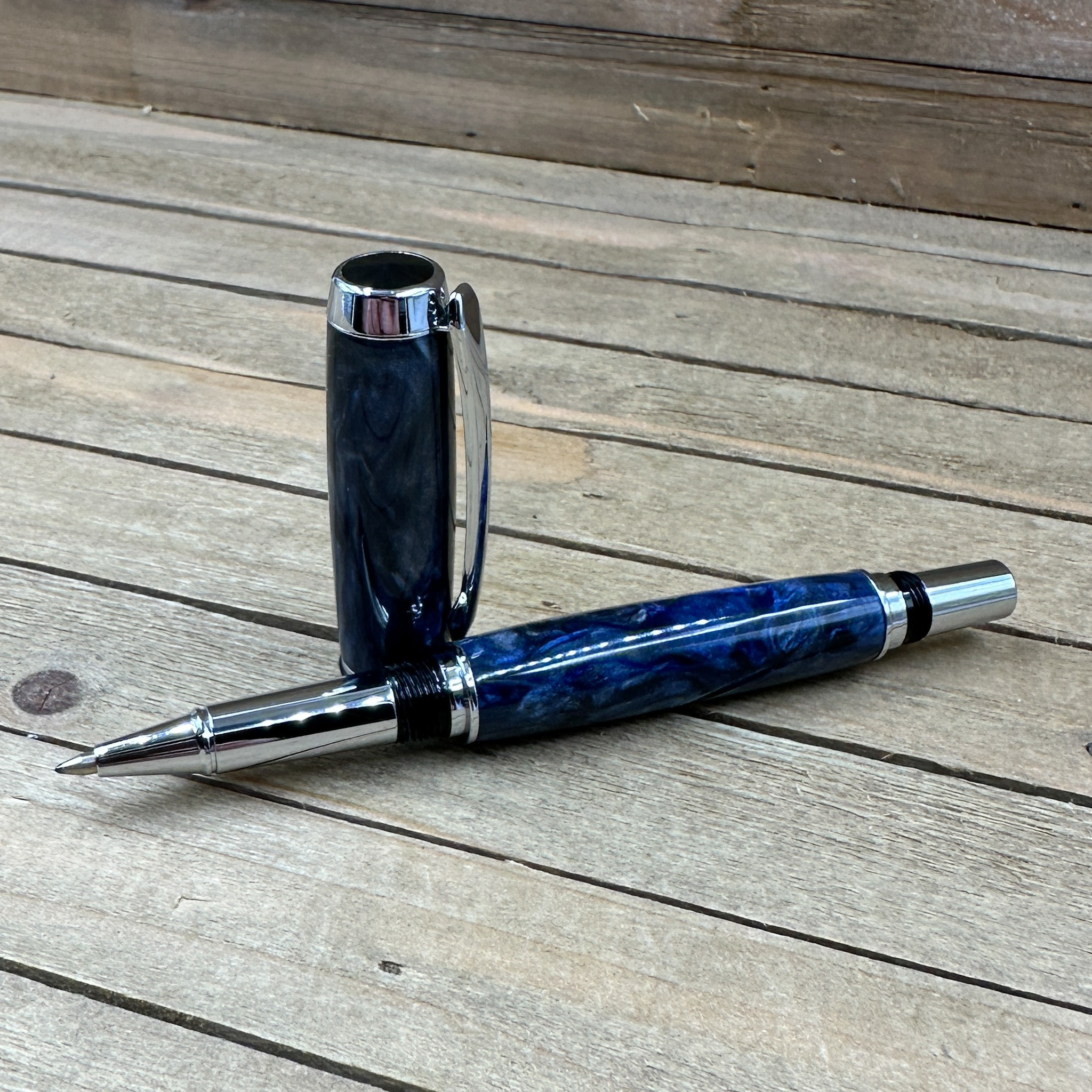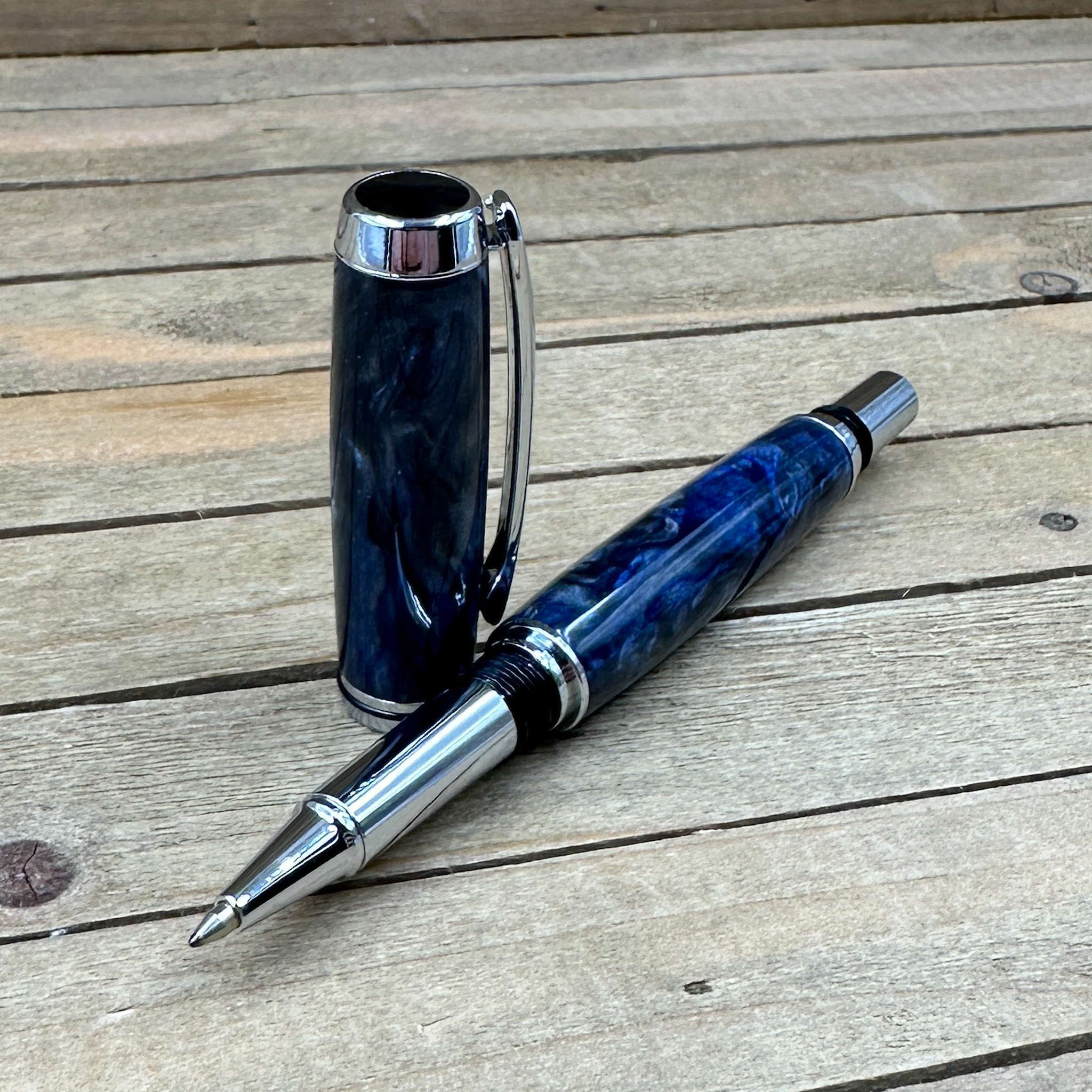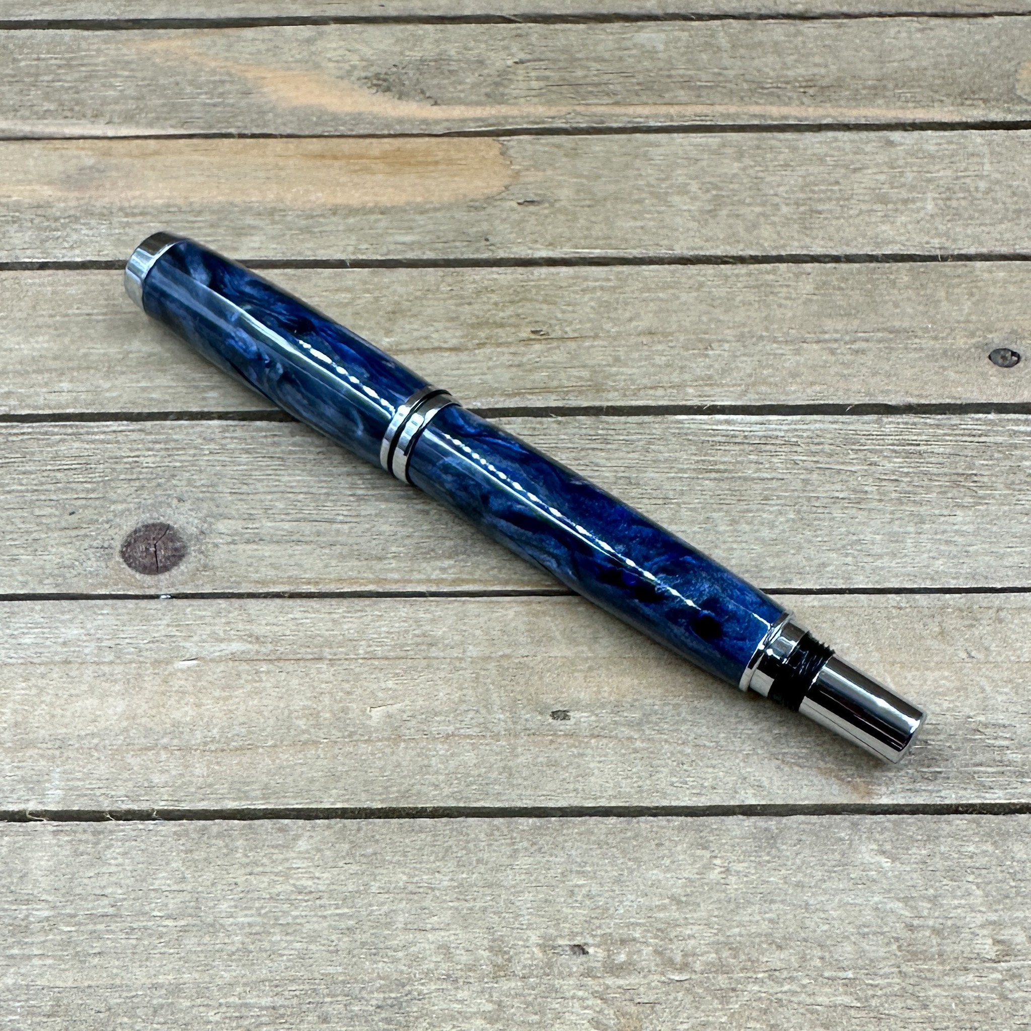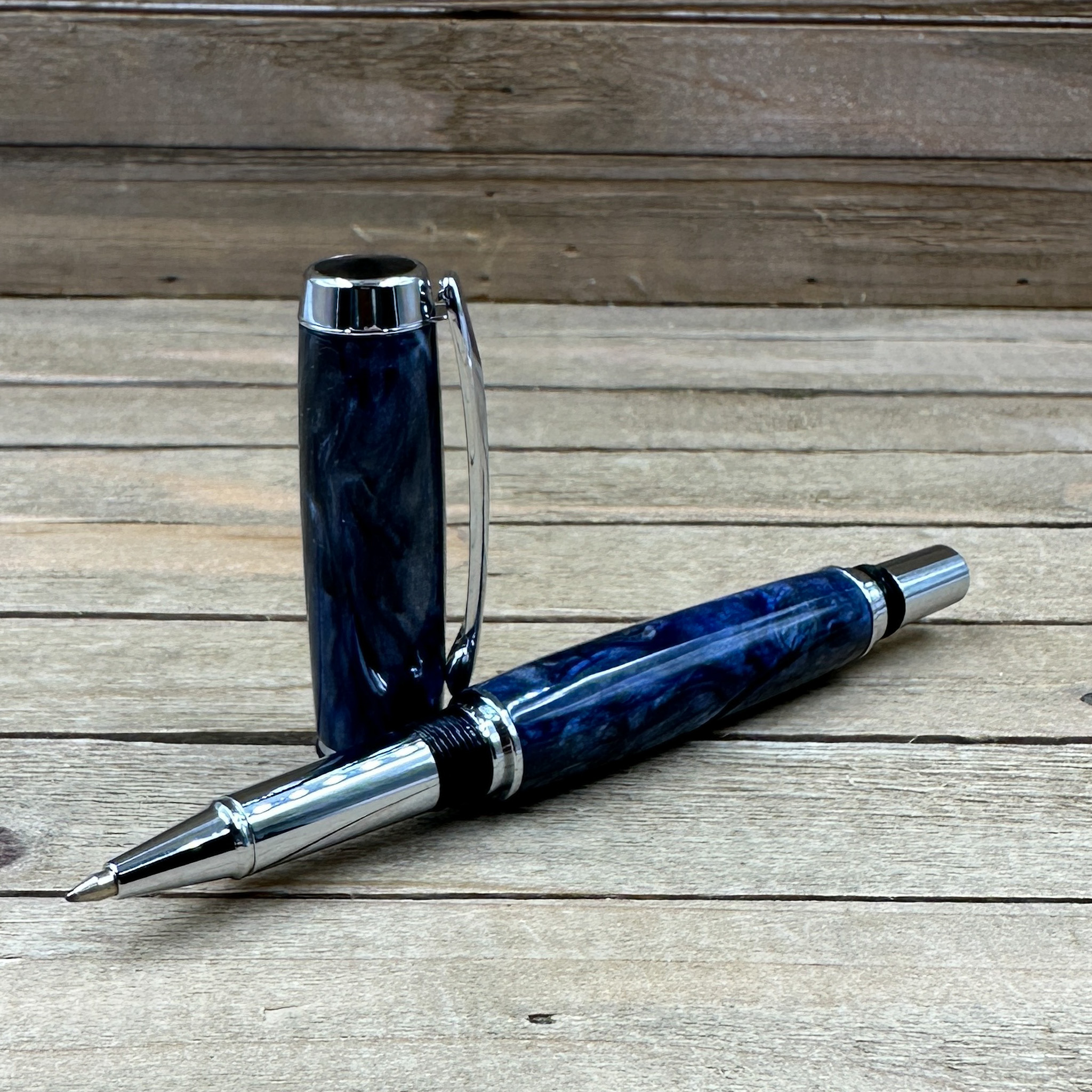 The body of this pen is crafted from a unique, deep-pour resin blend featuring deep navy blue swirling with accents of storm gray. The distinctive, shimmering pattern ensures that no two pens are exactly alike—making this a truly one-of-a-kind accessory for your desk or pocket.