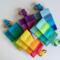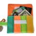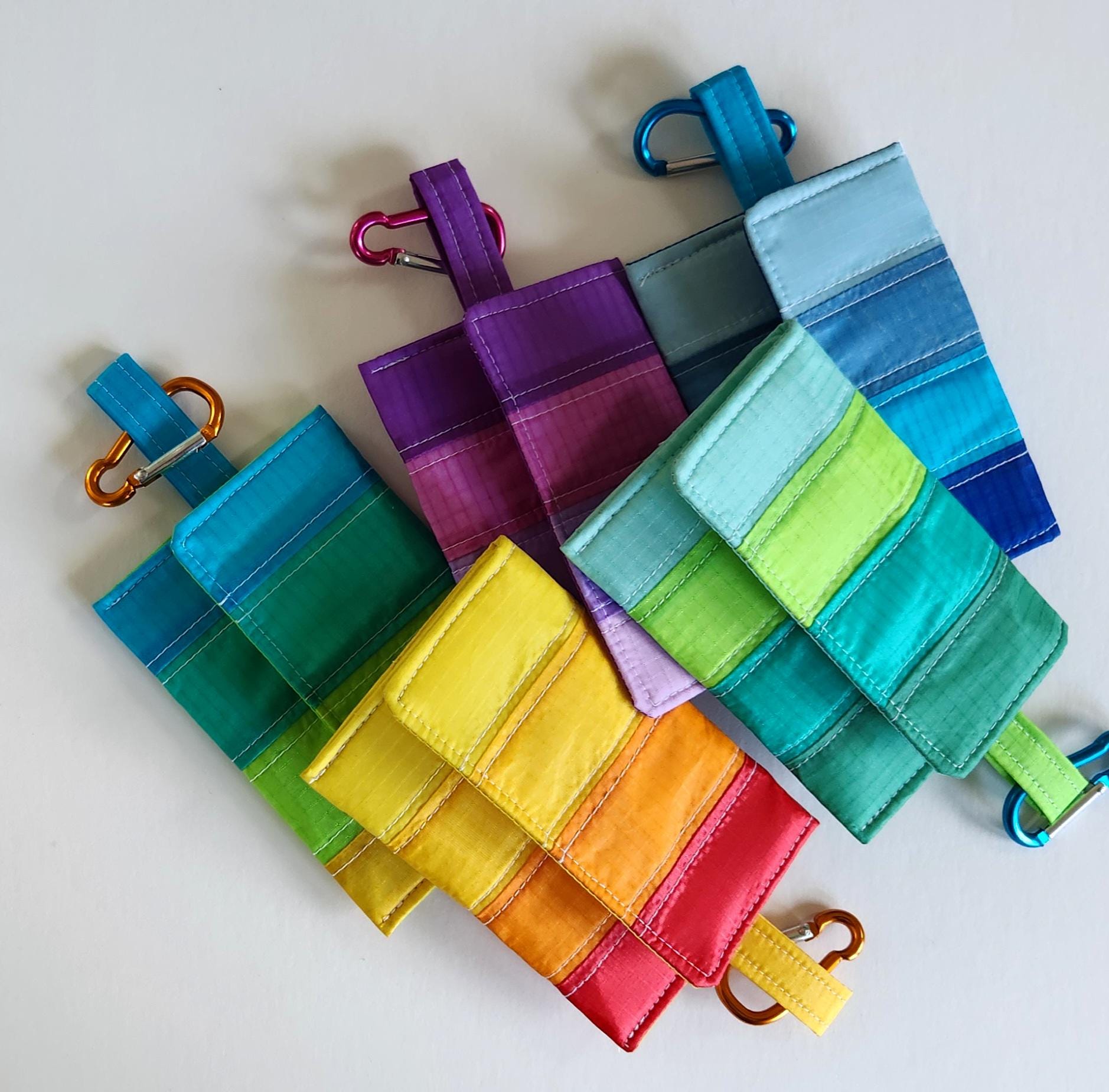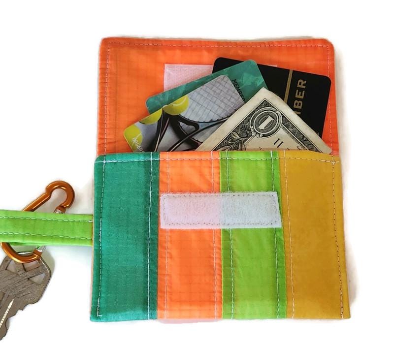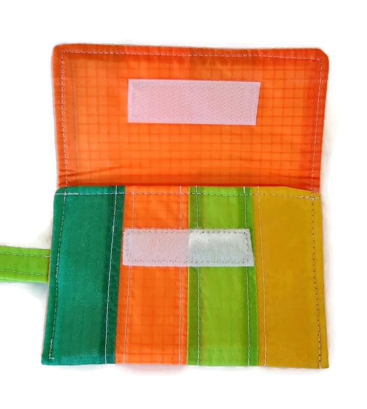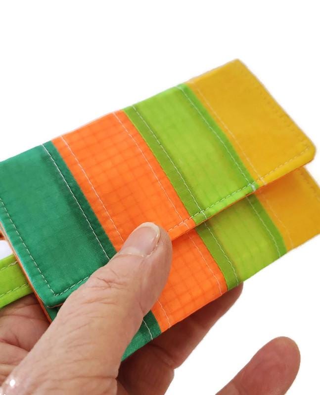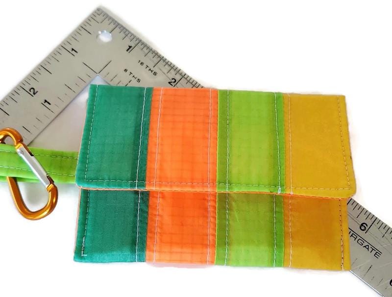 Practically weightless this little case will hold the essentials for a long hike or bike ride or a quick trip to the store. A few cards- id, credit and a little cash tuck compactly into the velcro closure case along with your keys . Clip it to your belt, your pants belt loop or even on a chain or cord around your neck. Or just slide it into your pocket, backpack or purse- the vibrant bold colors make it easy to find. The tiny colorful striped wallet is interfaced and lined in recycled paraglider orange fabric. Washable.