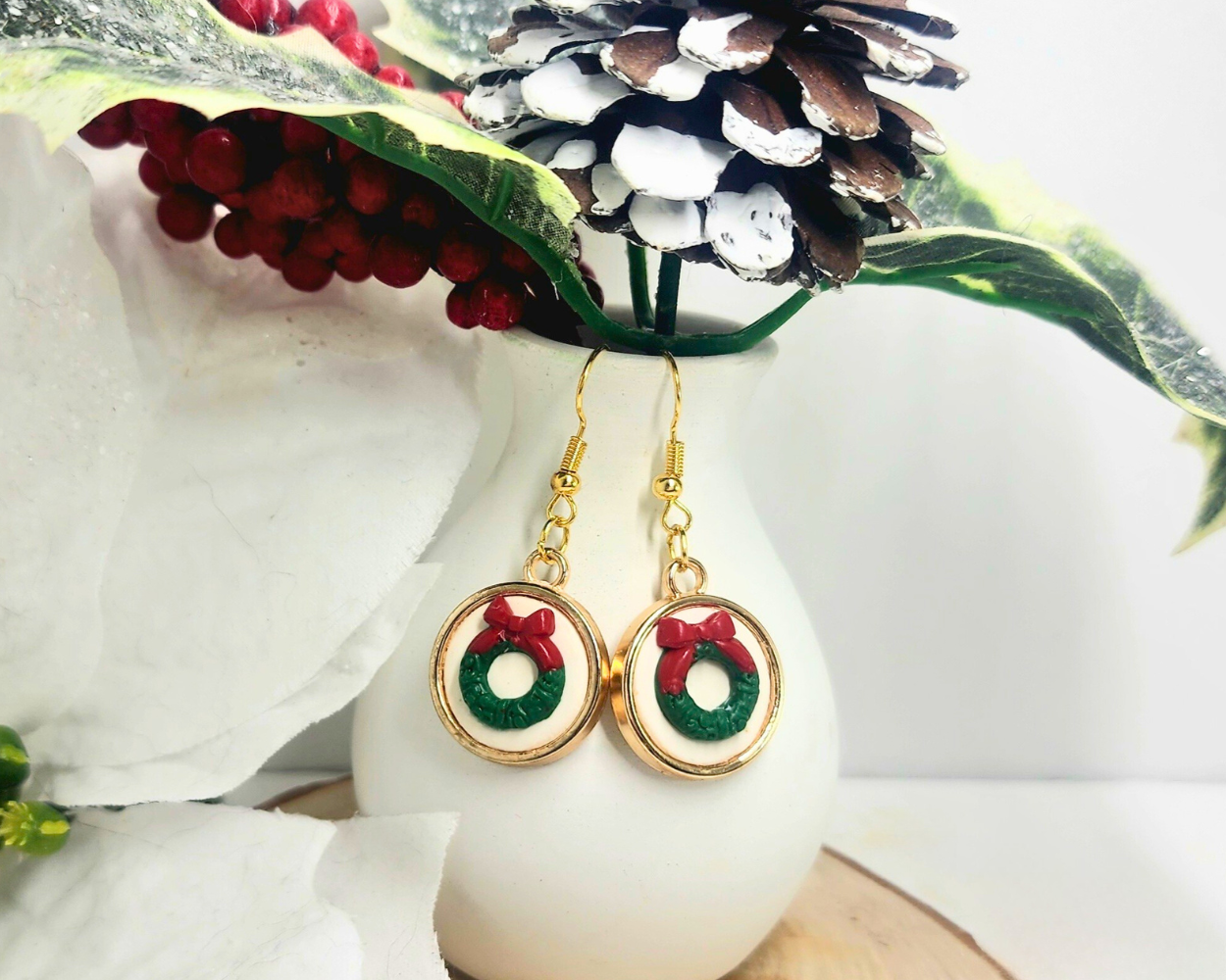 These elegant Christmas Wreath Dangle Earrings capture the timeless beauty of the holiday season. Each earring features a miniature, hand-sculpted polymer clay wreath in deep green, perfectly accented with a classic red bow.