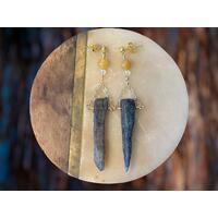 Each piece of clear quartz and carnelian beads are carefully selected to make a perfectly imperfect pair then 22 gauge gold toned wire is cut and wire wrapped through the gemstones to create partial eyelets. I then count each link of chain to verify each side is the same size and loop the chain in the eyelet before closing. This guarantees a flawless finish and ultimate strength between the chain and eyelets without the use of extra jump rings. I finish the earrings by connecting the 10k yellow gold plated posts.