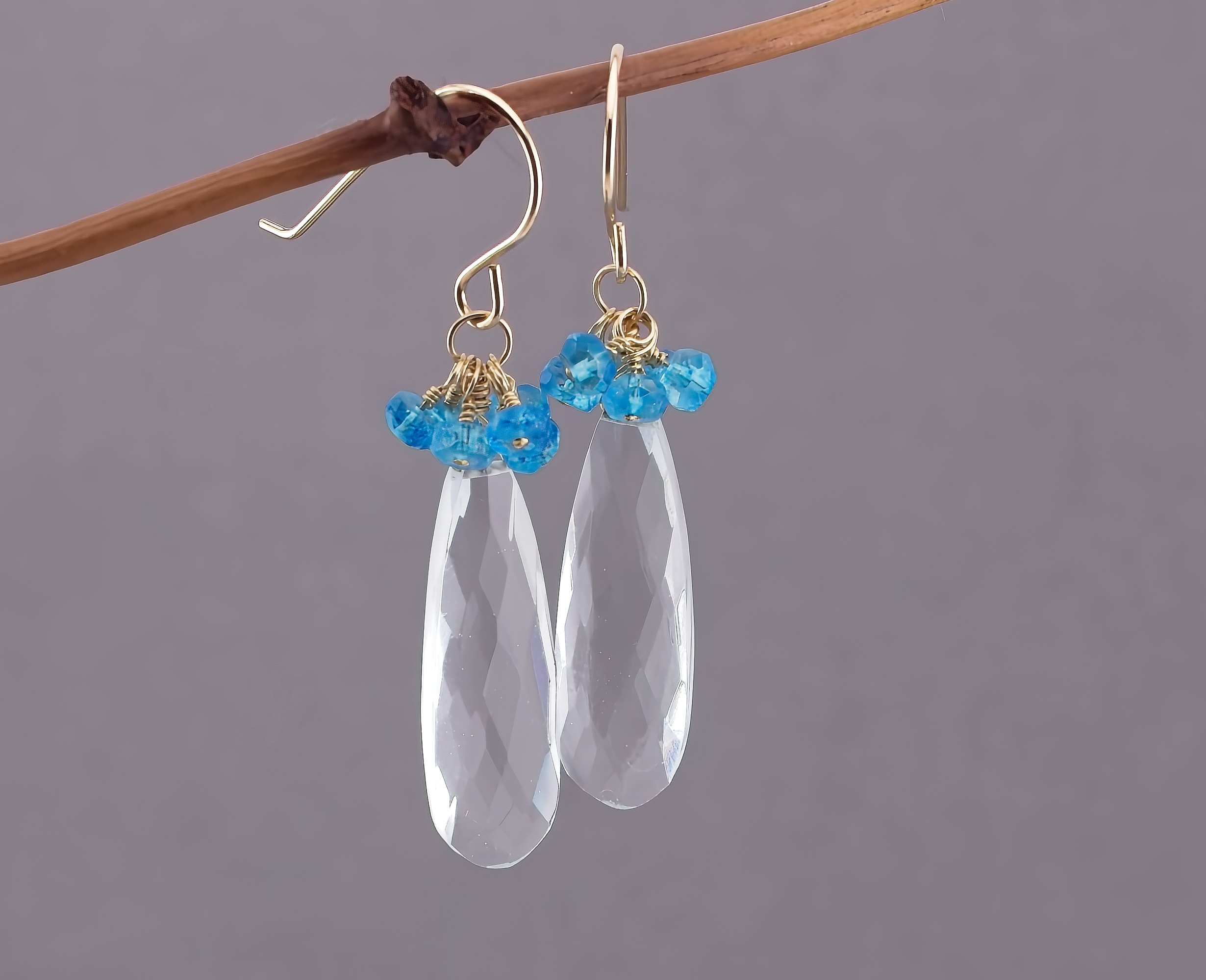 These luminous earrings pair sleek elegance with a splash of vibrant color. Faceted clear quartz teardrops catch the light with every movement, while sparkling clusters of Swiss blue quartz add a vivid pop reminiscent of tropical waters. Suspended from hand-forged gold-filled earwires and just over 2 inches long, they’re lightweight, graceful, and effortlessly eye-catching—perfect for dressing up your everyday or adding shimmer to a special night out.