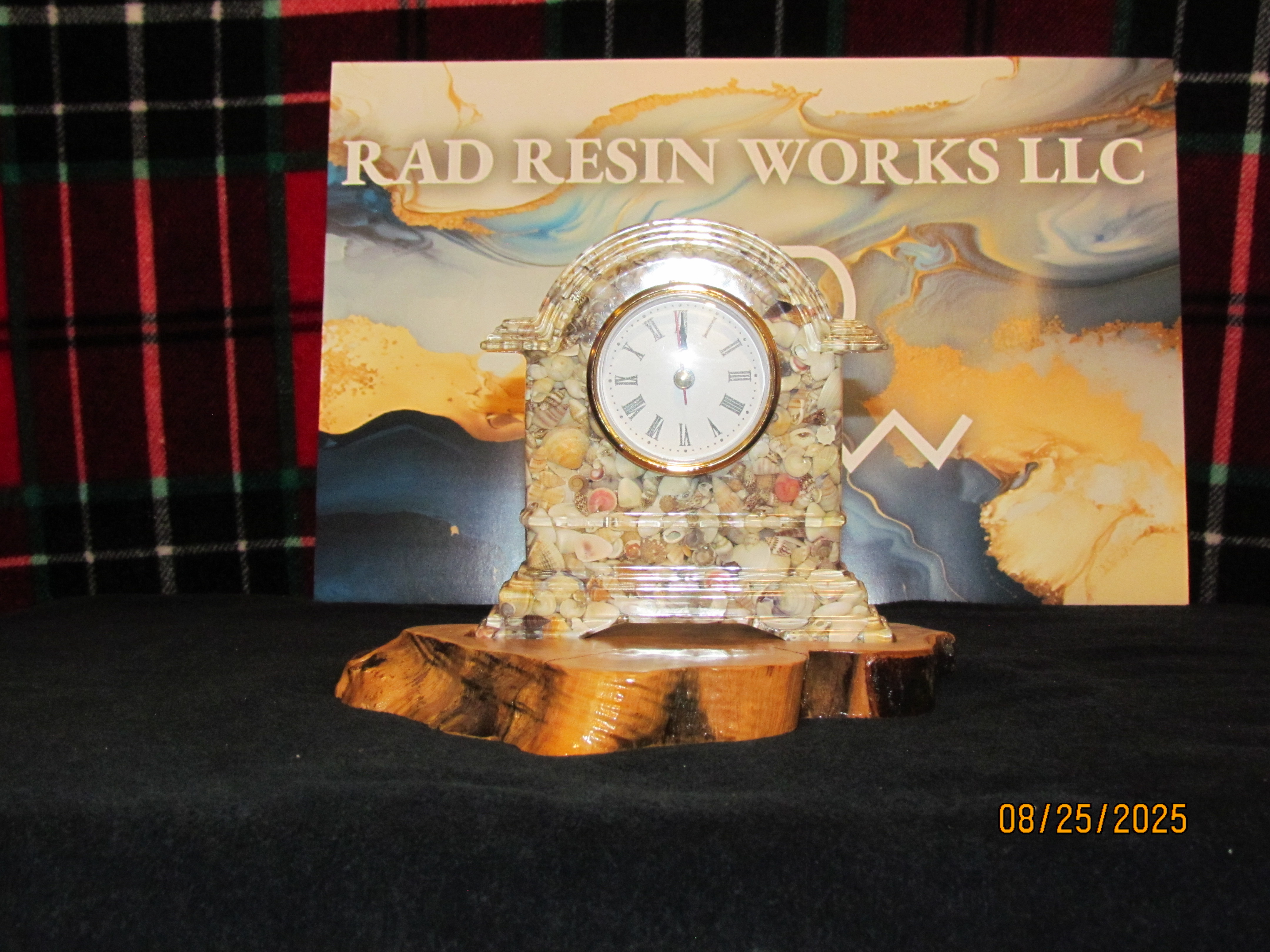 clock is made with seashells inside of it. it sits on a olive wood base