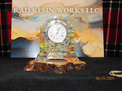 this very unique piece is full of marbles. it sits on a beautiful olive wood base