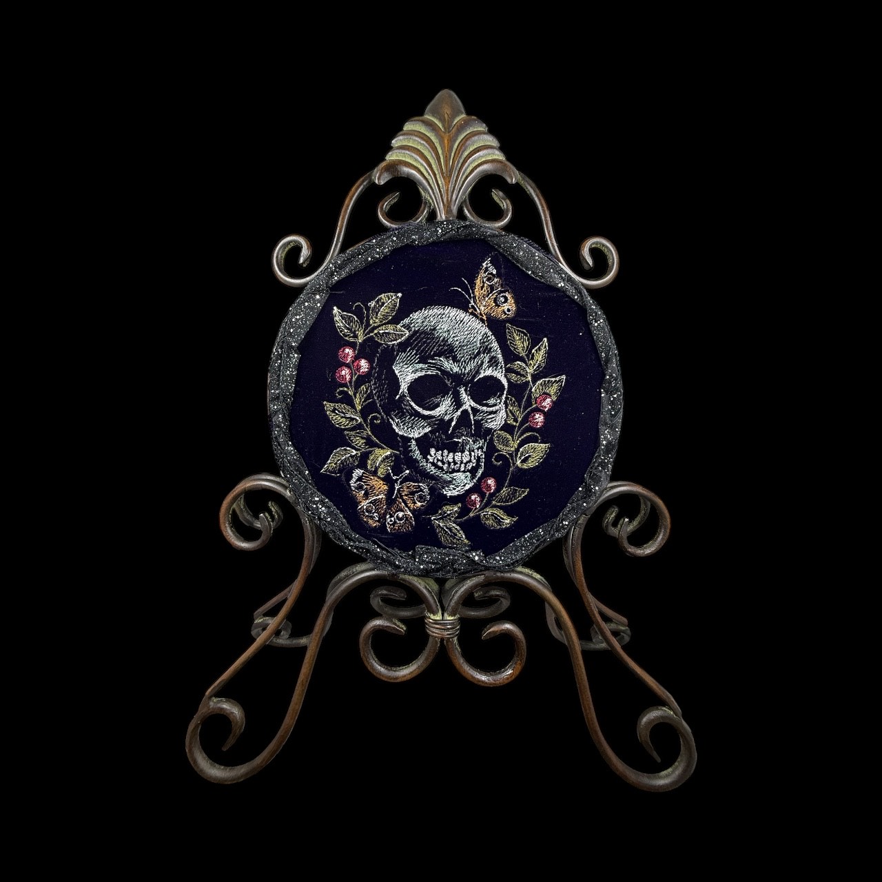 A beautiful, embroidered skull with berries, leaves and moths on a standing clock, with twisted ribbon around the outer edge.